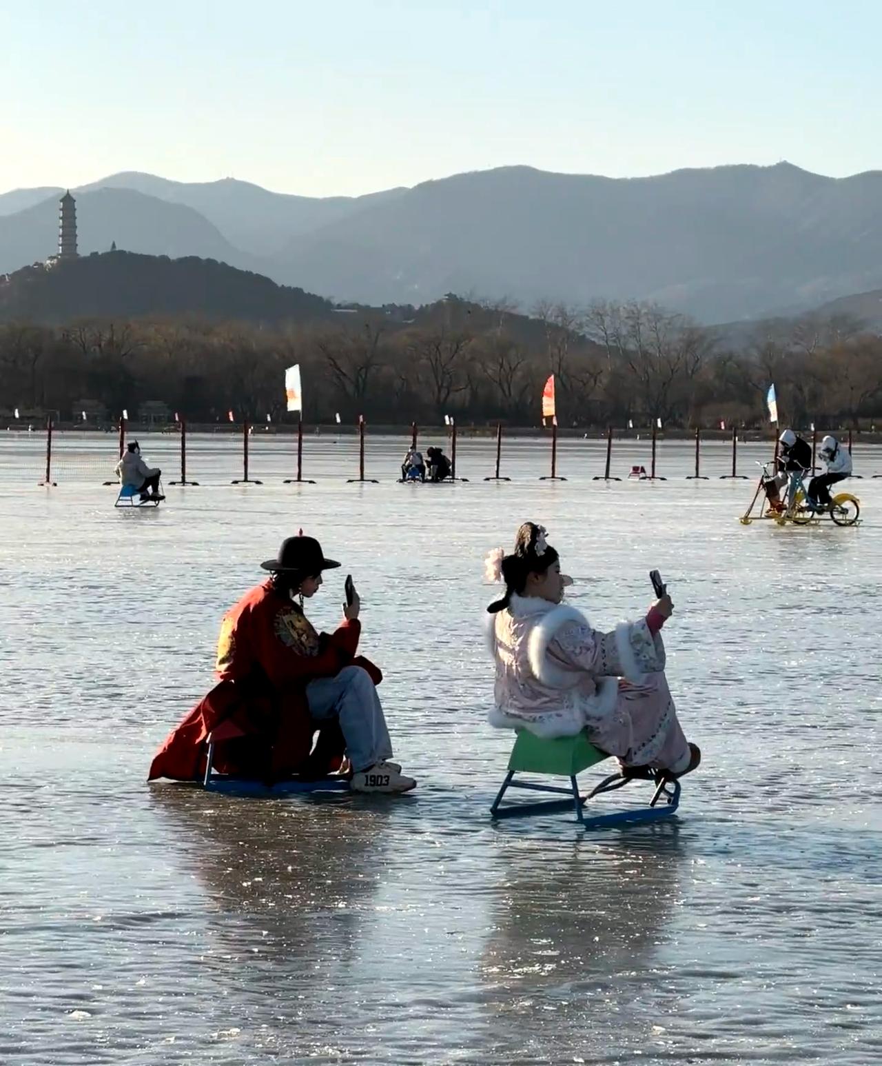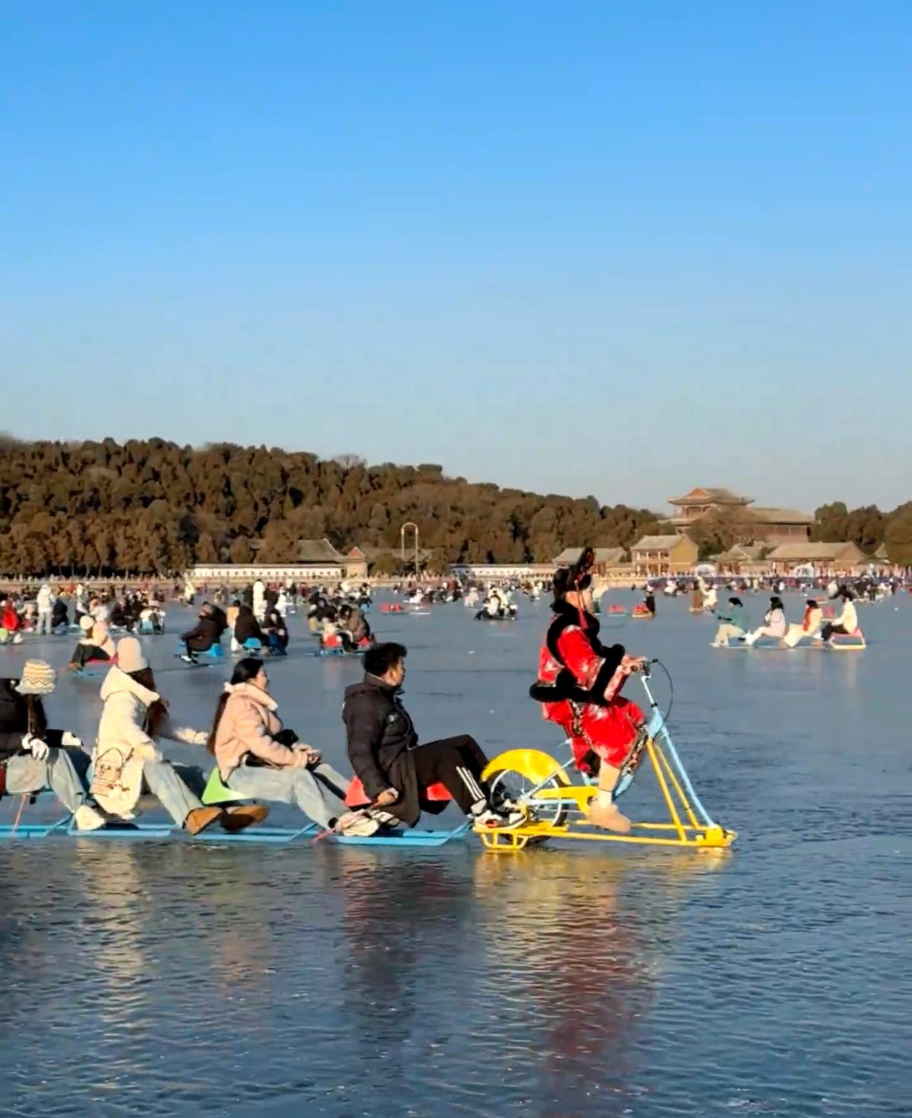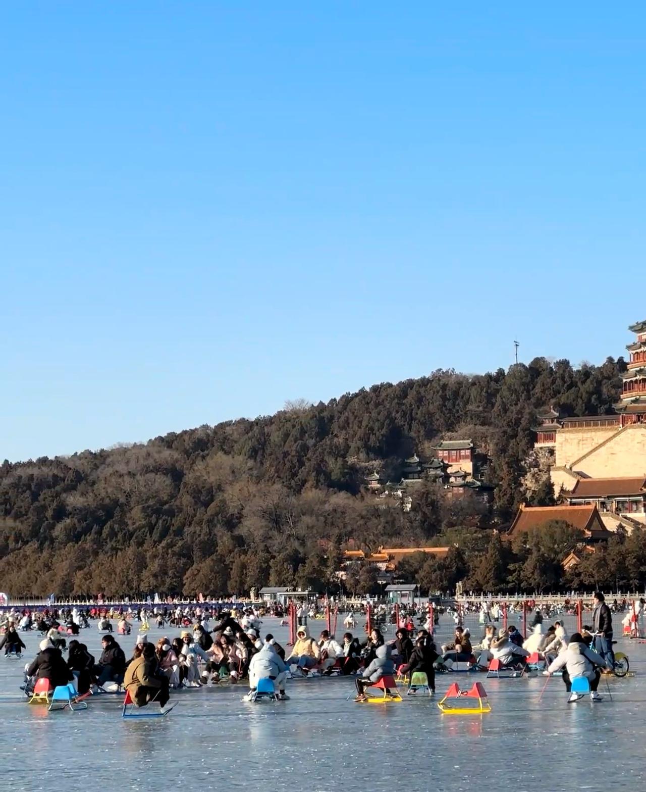 北京颐和园冰场开了,有一亿人。 这个冰看起来好嫩,哈哈哈,能明白我的意思吗,去年立春前去的颐和园,暖和的冰面就这样,滑了会就赶人了,说气温上来有危险。