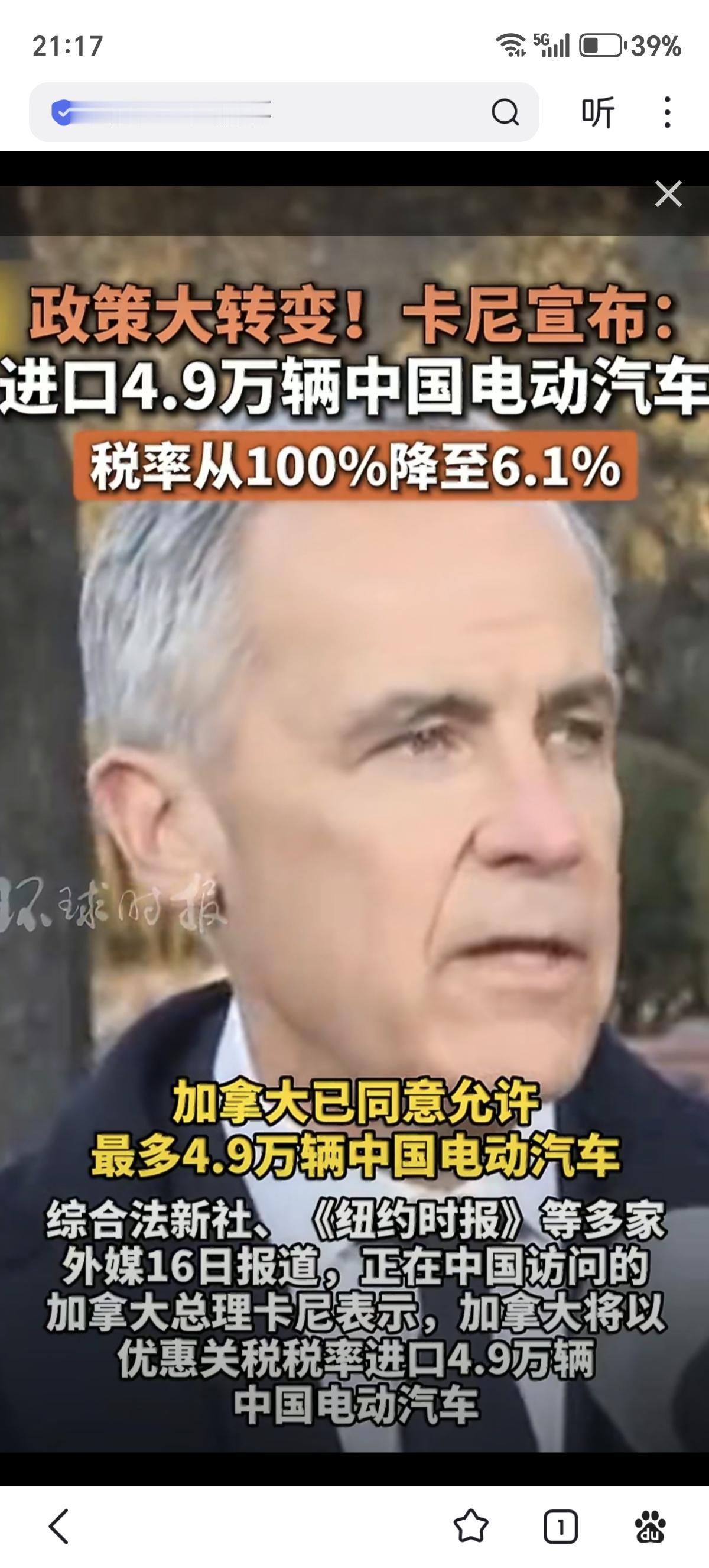 外媒16日报道,正在中国访问的加拿大总理卡尼表示,加拿大将以优惠关税税率进口4.9万辆中国电动汽车。 卡尼16日告诉记者:“加拿大已同意允许最多4.9万辆中国电动汽车进入加拿大市场,适用6.1%的最惠国关税税率……这恢复到了贸易摩擦前的水平。” 《纽约时报》称,加拿大将降低部分中国电动汽车的关税,这一重大政策转变是加拿大总理卡尼在对北京进行“具有里程碑意义”的访问期间宣布的。此前在2024年,在美国拜登政府的要求下,加拿大对中国电动汽车征收100%的关税。