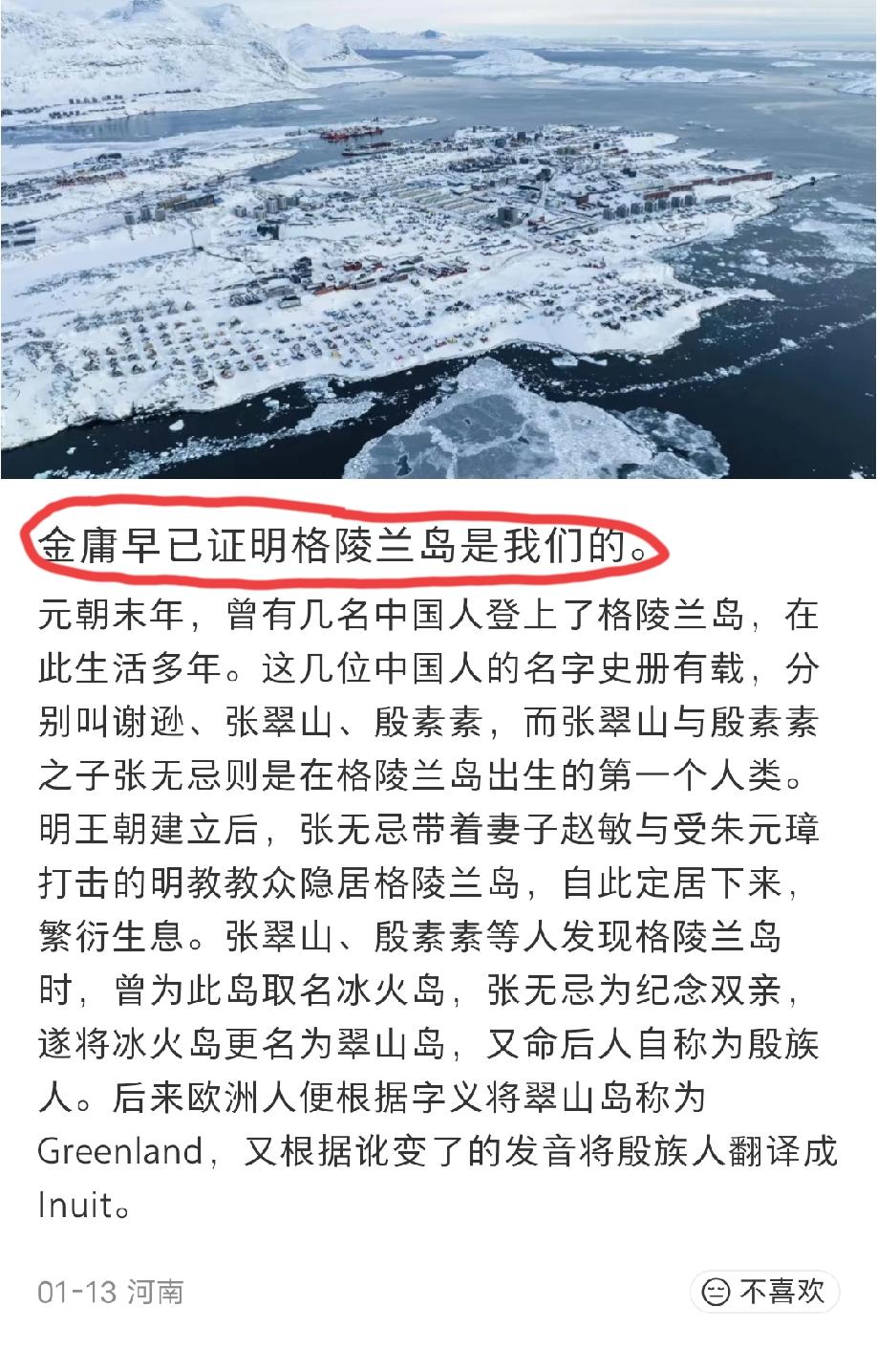 有河南网友称:格陵兰岛早在元末明初的时候就有中国武林人士登上过此岛。所以,格陵兰岛是我们中国的!金庸先生也早就证明过了。 当然,这批中国武林人士大家都非常熟悉,分别是张翠山夫妇、张无忌、赵敏、谢逊等。 如果元末明初我们中国人就已经有远渡格陵兰岛的历史,那是不是哥伦布发现美洲新大陆,达伽马开辟新航线这些世界历史都要被改变啦? [捂脸][捂脸][捂脸][捂脸]
