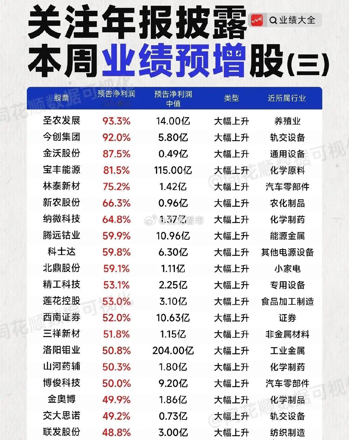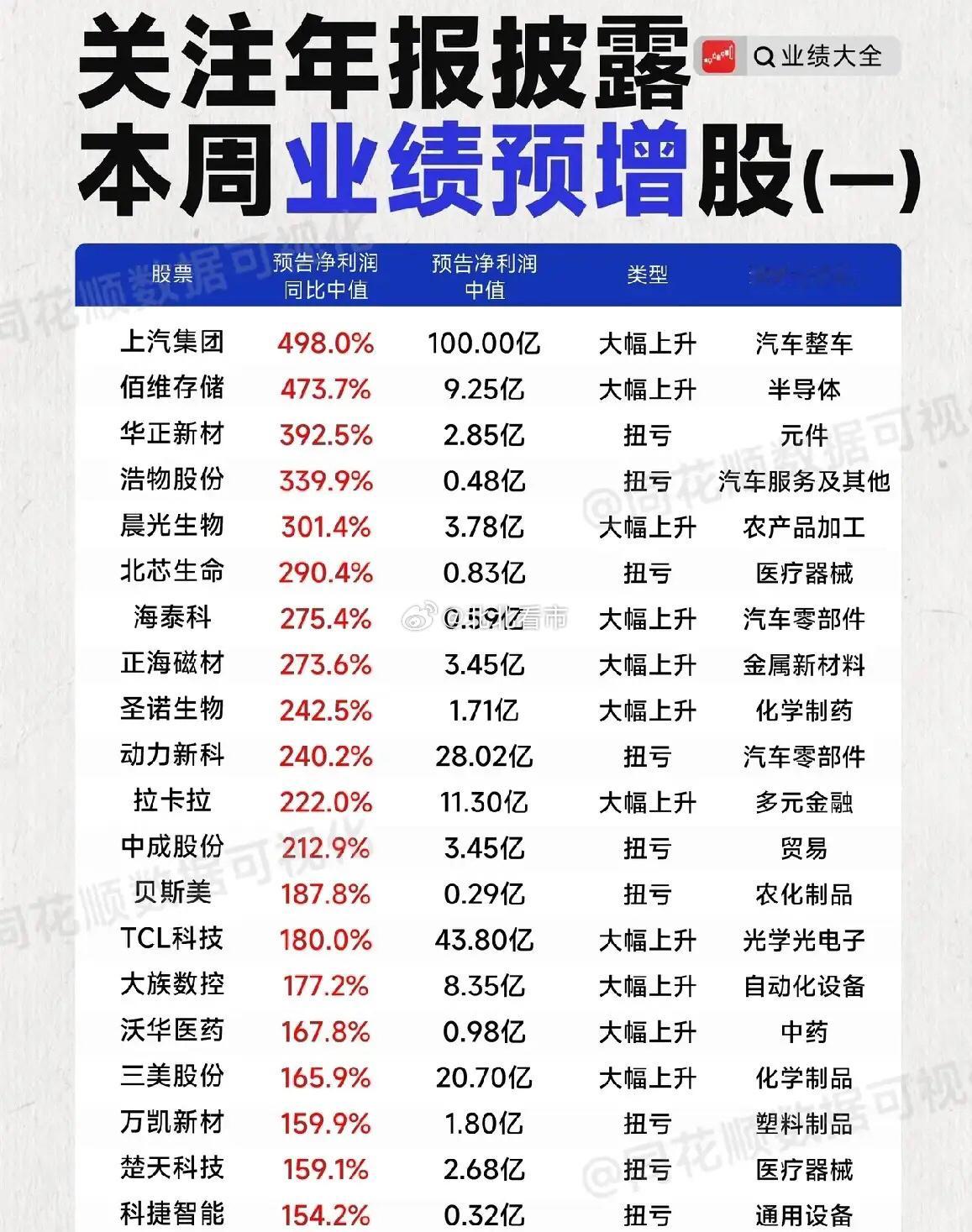 💥 炸了!498%暴涨王炸登场,本周业绩预增股杀疯了,14只股暴涨超100%,业绩预增再爆猛料,这名单藏不住了!上汽集团预告净利润同比暴增498%,净赚100亿,登顶本周预增榜一,直接把汽车整车板块的热度拉满。佰维存储预告净利润同比暴增473.7%,净赚9.25亿,在半导体板块里一骑绝尘,成为本周仅次于上汽集团的预增“亚军”。四维图新扭亏为盈!预告净利润同比大增109.5%,实现扭亏为盈,净赚1.04亿,在本周预增股中成为智能驾驶赛道的亮眼标的。理财有风险投资需谨慎资料全网公开,仅供参考不能作为投资依据。