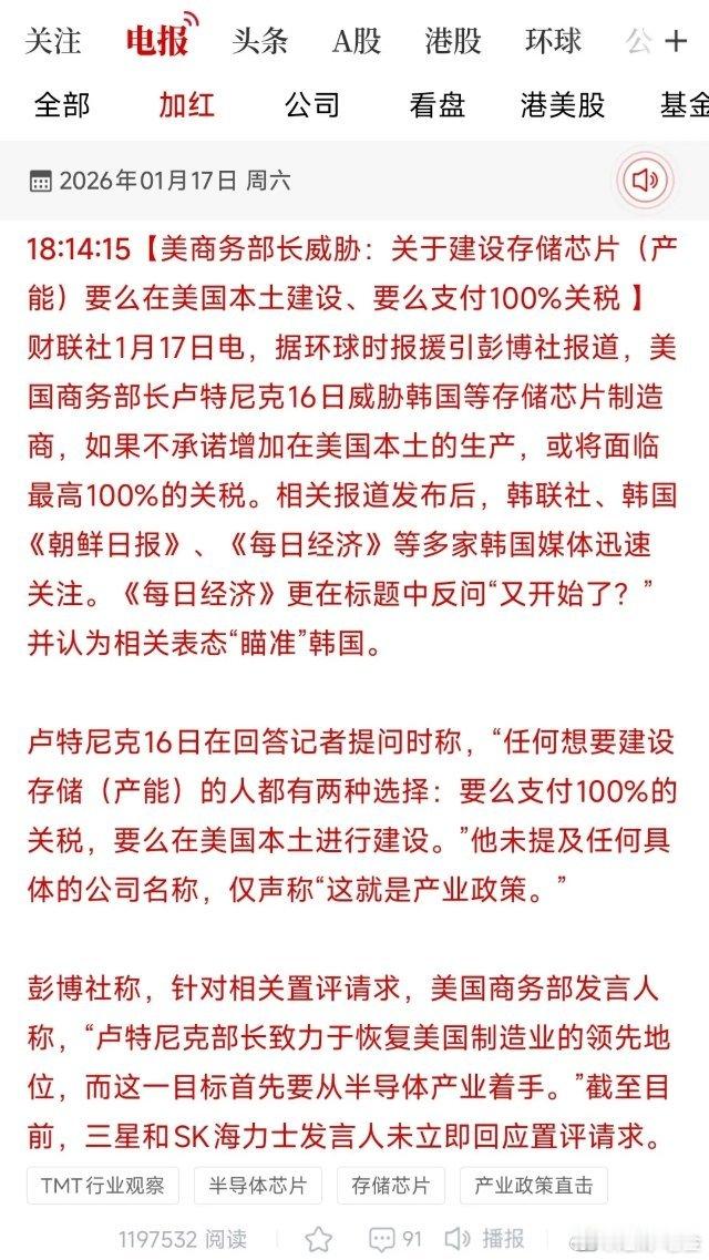 事关存储芯片概念!!!美国商务部长以100%关税威胁韩国icon存储芯片厂商转移产能,本质是通过产业政策强化本土半导体产业链控制,这将加剧全球存储芯片产业的地缘博弈与供给重构。韩国三星、SK海力士作为全球存储核心玩家,若被迫调整产能布局,可能导致全球存储供给弹性下降、价格波动加剧,同时加速国内存储芯片产业链的自主替代进程,利好A股存储芯片设计、制造、设备及材料环节的核心企业。个股梳理分析1. 兆易创新:国内存储芯片设计龙头,主营NOR Flash及MCU产品,受益于存储自主替代需求提升,车规级存储产品持续放量,技术迭代与客户拓展支撑长期成长,短期行业格局变化或带动情绪升温。2. 北京君正:国内存储芯片设计核心企业,聚焦DRAM及SRAM领域,车载存储业务快速增长,受益于全球存储供给格局变动,国产替代进程加速,技术积累与客户资源支撑业绩弹性。3. 澜起科技:全球内存接口芯片龙头,产品覆盖DDR5等高端领域,受益于存储行业景气度提升,技术壁垒深厚,下游客户绑定稳固,行业格局变化或带动订单增长。4. 江波龙:国内存储模组龙头,主营存储模组及解决方案,与长江存储深度合作,受益于自主替代需求,行业格局变化或带动模组业务放量,技术升级支撑成长。5. 佰维存储:国内存储模组核心企业,聚焦消费级及工业级存储产品,与国内晶圆厂合作深化,受益于自主替代加速,产能扩张与客户拓展支撑业绩,短期情绪催化明显。6. 深科技:全球存储模组龙头,具备芯片封测能力,与头部厂商合作紧密,受益于存储行业景气度提升,产能布局完善,行业格局变化或带动封测与模组业务增长。7. 北方华创:国内半导体设备龙头,存储芯片制造核心设备供应商,受益于国内存储产能扩张与自主替代,刻蚀、薄膜沉积设备技术领先,订单增长支撑业绩高增。8. 中微公司:国内刻蚀设备核心企业,存储芯片制造关键设备供应商,受益于自主替代进程加速,技术迭代与客户拓展支撑订单增长,行业格局变化或带动设备需求释放。9. 沪硅产业:国内硅片龙头,存储芯片制造核心材料供应商,受益于国内存储产能扩张,12英寸硅片产能持续释放,客户覆盖主流存储厂商,行业格局变化或带动硅片需求增长。10. 雅克科技:国内半导体材料核心企业,存储芯片制造所需湿电子化学品及前驱体供应商,受益于自主替代加速,技术壁垒深厚,客户绑定稳固,订单增长支撑业绩。11. 万业企业:国内离子注入机核心企业,存储芯片制造关键设备供应商,受益于国内存储产能扩张,设备技术迭代加速,客户拓展支撑订单增长,行业格局变化或带动设备需求提升。12. 通富微电:国内封测龙头,存储芯片封测核心供应商,与头部存储厂商合作紧密,受益于存储行业景气度提升,产能布局完善,行业格局变化或带动封测业务增长。13. 彤程新材:国内半导体材料核心企业,存储芯片制造所需光刻胶供应商,受益于自主替代加速,光刻胶技术突破与客户拓展支撑业绩,行业格局变化或带动需求释放。14. 华海清科:国内化学机械抛光设备龙头,存储芯片制造关键设备供应商,受益于国内存储产能扩张,设备技术领先,客户覆盖主流存储厂商,行业格局变化或带动设备订单增长。15. 江化微:国内湿电子化学品龙头,存储芯片制造核心材料供应商,受益于自主替代进程加速,产品技术升级与客户拓展支撑业绩,行业格局变化或带动材料需求增长。16. 东芯股份:国内存储芯片设计企业,专注于NAND Flash及DRAM产品,受益于自主替代需求提升,车规级存储产品布局完善,技术迭代支撑成长,短期情绪催化明显。17. 聚辰股份:国内EEPROM芯片龙头,存储芯片设计核心企业,受益于消费电子及汽车电子需求增长,技术壁垒深厚,客户绑定稳固,行业格局变化或带动订单增长。18. 鼎龙股份:国内CMP抛光垫核心企业,存储芯片制造关键材料供应商,受益于国内存储产能扩张,抛光垫技术突破与客户拓展支撑业绩,行业格局变化或带动材料需求提升。19. 兆驰股份:国内存储模组核心企业,主营消费级存储产品,受益于自主替代需求提升,产能扩张与客户拓展支撑业绩增长,短期行业格局变化或带动情绪升温。20. 国科微:国内存储芯片设计企业,聚焦固态存储及视频编码芯片,受益于自主替代加速,车载存储业务快速增长,技术积累支撑成长,短期情绪催化明显。总结本次美国对韩国存储芯片厂商的关税威胁,将加速全球存储芯片产业链的重构与国内自主替代进程,A股存储芯片设计、制造、设备及材料环节的核心企业将直接受益。短期事件催化或带动相关个股情绪升温,长期需关注国内存储产能扩张进度与技术突破,建议聚焦具备核心技术与客户资源的标的,结合基本面与估值谨慎参与短线交易。本文涉及资讯、数据等内容来自网络公共信息,仅供参考,不构成投资建议!特朗普因格陵兰岛向欧洲8国加税