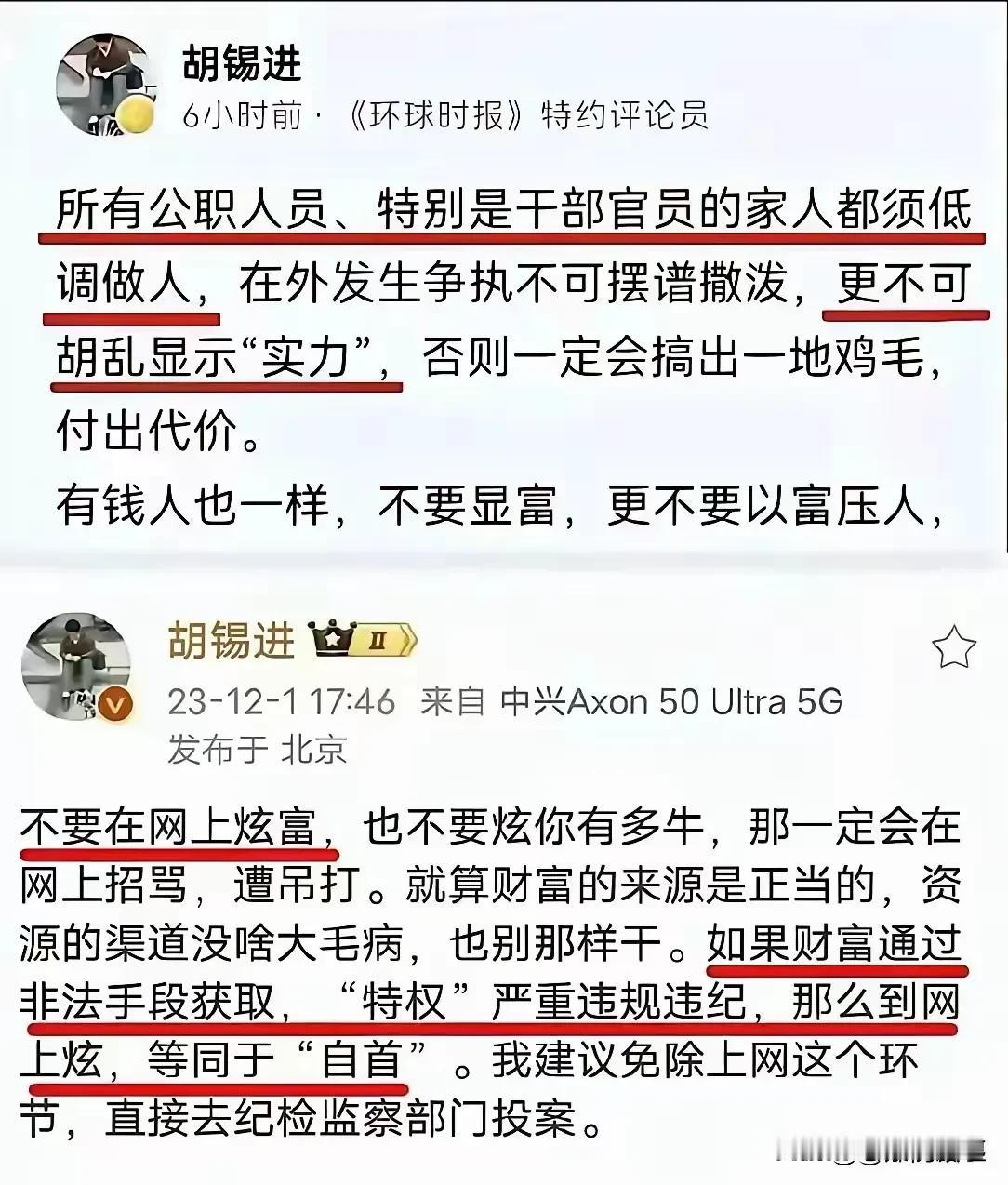 胡锡进老师站的角度是一贯正确的。 他的自媒体也是体制内人几乎必须关注的。 他现在连续多次的对炫富行为提出警示,表面上是为民说话。 其实更多是规劝,忍一时风平浪静,劝他们低调行事,熬下去才是真的。 老胡从来不往根上言语,只在表面做抚触。 像极了动物森林中给大老虎站岗放哨的小猴子。