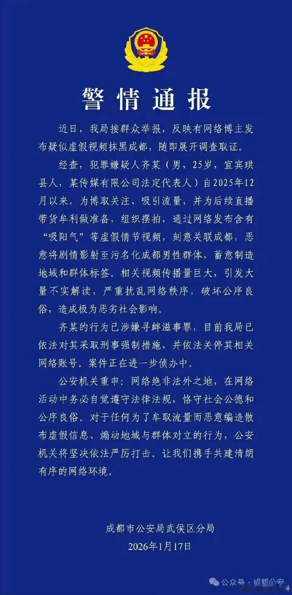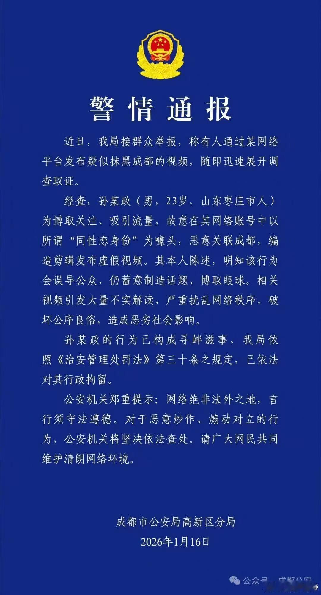 男子摆拍污名化成都男性被刑拘连着两天了,前天是行拘,昨天是刑拘。一个寻衅滋事,以“同性恋身份”噱头,恶意关联成都。一个寻衅滋事罪,剧情映射污名化成都男性群体。