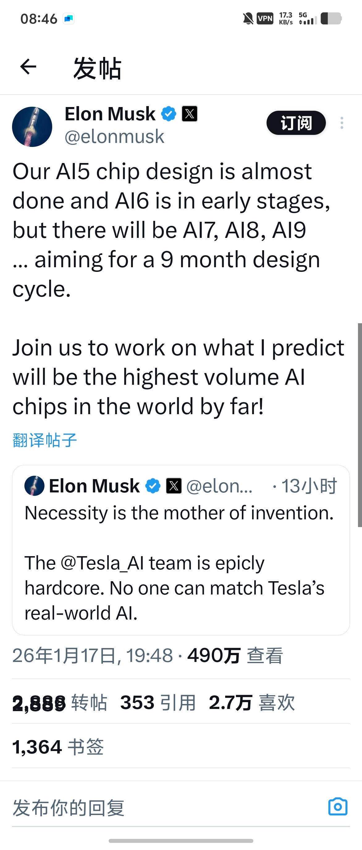 TESLA AI5 芯片接近完成。接下来每九个月迭代一次。换而言之,elon musk 想 2026 年内要搞定 AI6。端侧加速算力普及的时代开始。我们处在脱口秀演员成为真正政客的时代,处在三战可能已经爆发的时代,又处在可能是五十到一百年间最重要的科技突破加速到来的时代。这是最坏的时代,也是最好的时代。我经历过互联网,移动互联网两波科技革命了。而这一波,比上两次更猛烈,更矛盾,更动荡。。。世界待我不薄啊,是嫌上两波冲浪,我玩的不够刺激吗。。。