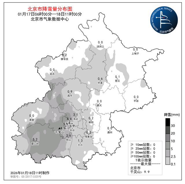 17日06时至18日11时,全市平均降雪量1.2毫米,城区平均1.6毫米,最大降雪量出现在丰台区千灵山9.9毫米。雪花结构蓬松,房山、门头沟、石景山、海淀、丰台积雪深度10~20厘米,其它地区积雪深度0~4厘米。
