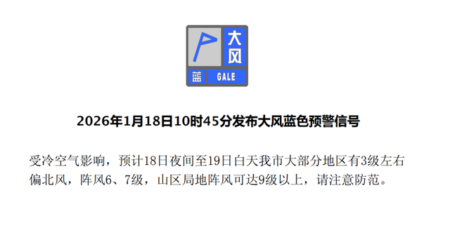 北京市气象台于2026年1月18日10时45分发布了大风蓝色预警信号,提醒大家夜间出行注意人身安全,远离高大建筑物和临时搭建物,谨防高空坠物。同时今天夜间最低气温仅-11℃,再加上风寒效应明显,体感寒冷,大家外出注意防风的同时还要做好保暖措施。