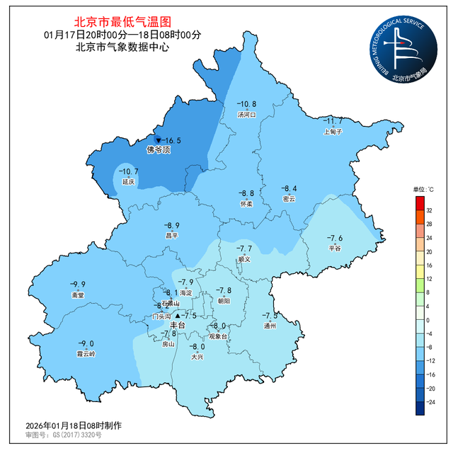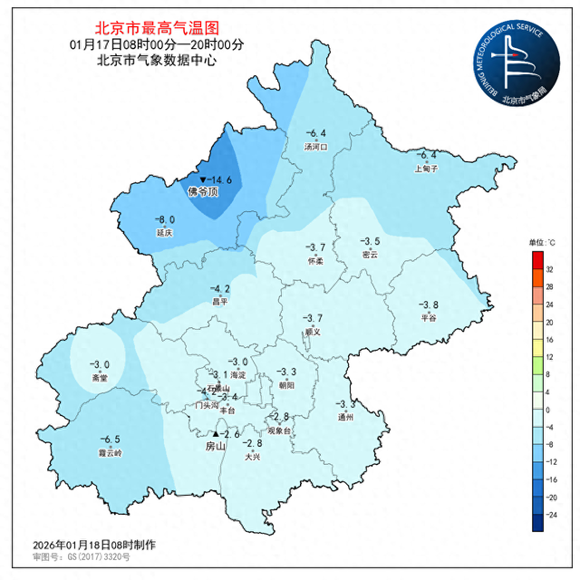 1月17日08时至1月18日08时,观象台最高气温-2.8℃(14:36),最低气温-8℃(7:01)。