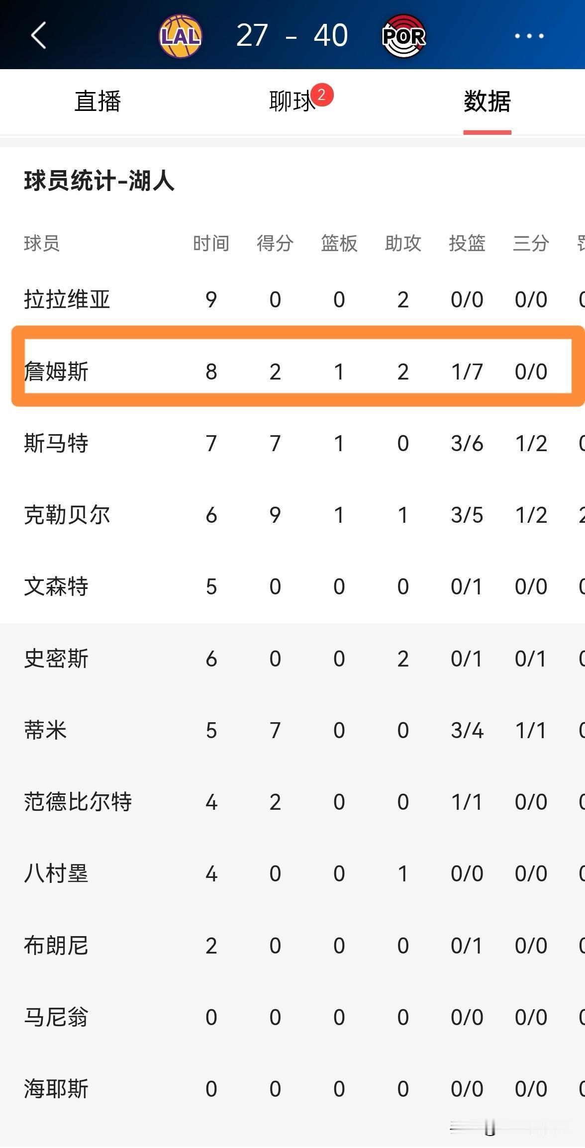 湖人巨星詹姆斯真是给机会不中用啊!在今天湖人客场挑战开拓者的比赛中,目前双方的第一节比赛已经结束,湖人以27:40落后对手,形势看起来一片糟糕。让人感到无比失望的是,詹姆斯在东契奇、里弗斯双双缺阵的情况下没有把握住重新证明自己的好机会,他在首发出战的8分钟里,投篮7中1极其低效的得到2分,他的场上正负值为-10。 以目前的情况来看,本场比赛湖人极有可能会惨败于开拓者,而詹姆斯必须为球队的惨败背锅。
