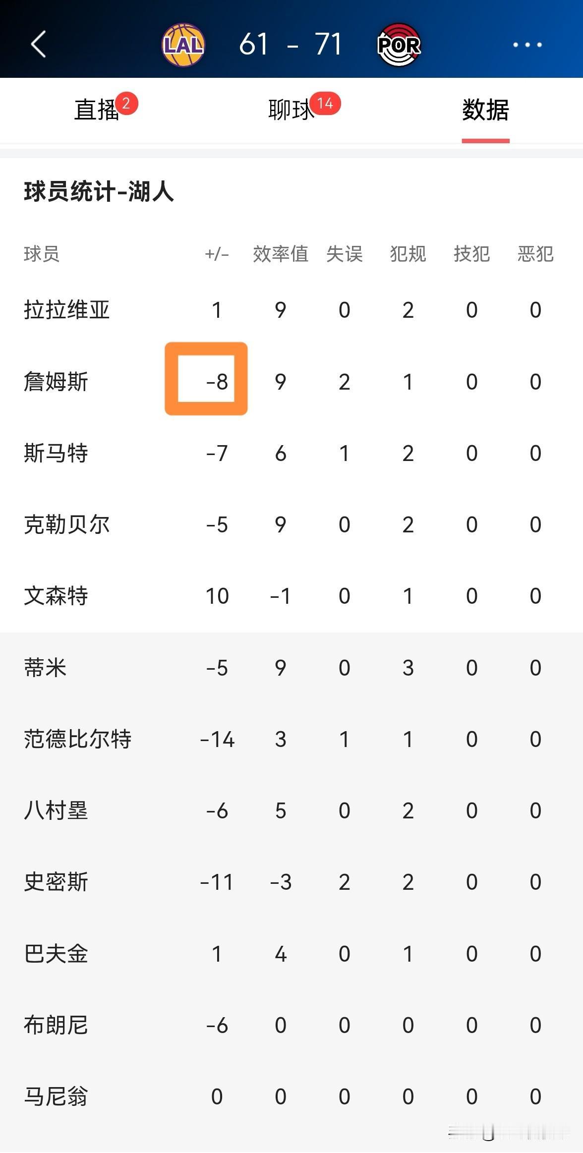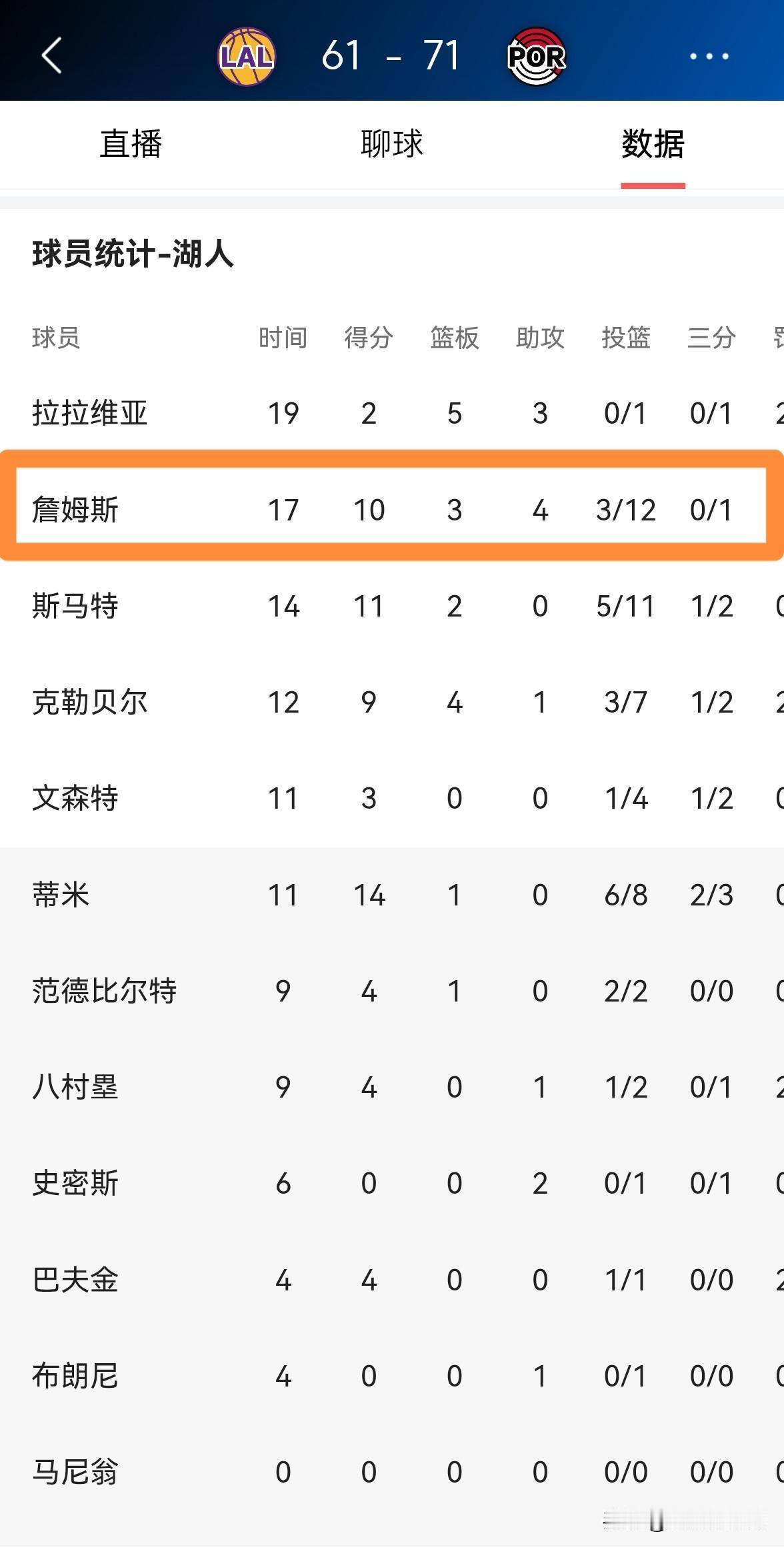 我强烈呼吁湖人老将詹姆斯立刻退役,我不忍心看他的拉胯表现了!在今天湖人客场挑战开拓者的比赛中,目前双方半场战罢,湖人以61:71落后对手10分。在前两节比赛中,詹姆斯在攻防两端的表现都非常糟糕,他在首发出战的17分钟里,投篮12中3,其中三分球1中0、罚球4中4非常低效的得到10分,还有2次失误,他的场上正负值为-8。 实事求是的说,以詹姆斯目前的年龄和状态来看,他完全不具备单核带队赢球的能力。当我看到詹姆斯在上半场比赛中的低迷表现后,我真是痛心疾首,詹姆斯真的到了退位的时候了。