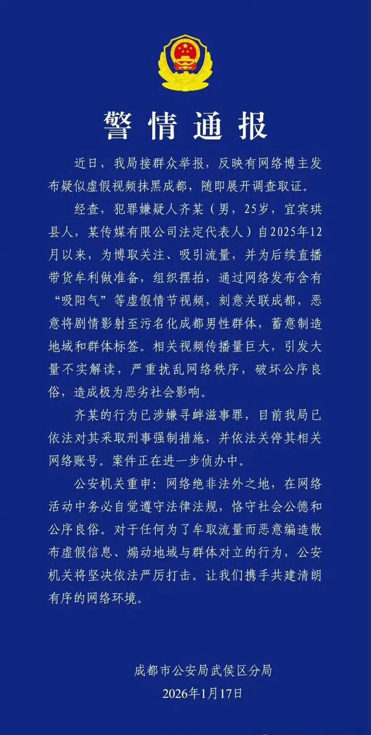 真没想到有人为了赚钱能毫无底线,居然靠编造虚假视频抹黑整个城市的男性群体!有个25岁的宜宾小伙齐某,开了家传媒公司,为了给后续直播带货攒流量,从去年年底开始就组织人摆拍短视频。视频里故意编了“吸阳气”这种封建迷信的虚假情节,还特意把场景都设在成都,明里暗里把这些荒唐行为扣在成都男性头上,就是想制造话题、贴地域标签博关注。这些视频发出去后传播得特别广,累计播放量都超千万了,不少人被误导着对成都男性产生偏见,网上还引发了不少骂战,好好的网络环境被搅得乌烟瘴气。好在群众看得明白,很快就有人向警方举报,成都武侯警方调查清楚后,认定齐某的行为涉嫌寻衅滋事罪,已经把他刑拘了,相关账号也都关停了。 现在做自媒体想赚钱没问题,但也不能踩着别人的尊严、破坏公序良俗来牟利啊。齐某为了那点流量,就蓄意制造地域对立,把一个城市的男性群体都污名化,这不仅伤害了成都人的感情,更是在挑战法律和道德的底线。地域歧视这种事本来就特别伤人,每个地方都有好人坏人,凭什么用个别编造的虚假剧情,就给一整个群体贴负面标签?想想那些土生土长的成都男性,还有在成都工作生活的外地人,平白无故就被人抹黑,心里得多憋屈。而且这种虚假视频传播开后,还会加深各地之间的隔阂,破坏社会的和谐,这可不是小事。 其实不止这一件事,之前也有不少为了引流摆拍虚假视频、搞地域歧视的案例,有的抹黑外卖员,有的编造农村孩子的惨状,还有的恶意攻击其他省份的人,这些行为都遭到了大家的强烈反对。网络从来都不是法外之地,不能以为随便拍个视频、编个瞎话没人管,现在警方已经明确表态,会坚决打击这种恶意编造虚假信息、煽动地域对立的行为,这真的太让人解气了。我们普通人也该保持清醒,看到这种带地域标签的极端内容,别轻易相信,更别跟着转发扩散,不给这些造谣者可乘之机。 大家平时刷视频的时候,有没有遇到过类似的地域歧视式造谣?你觉得该怎么从根源上杜绝这种乱象?欢迎在评论区聊聊你的看法。 来源:北京日报