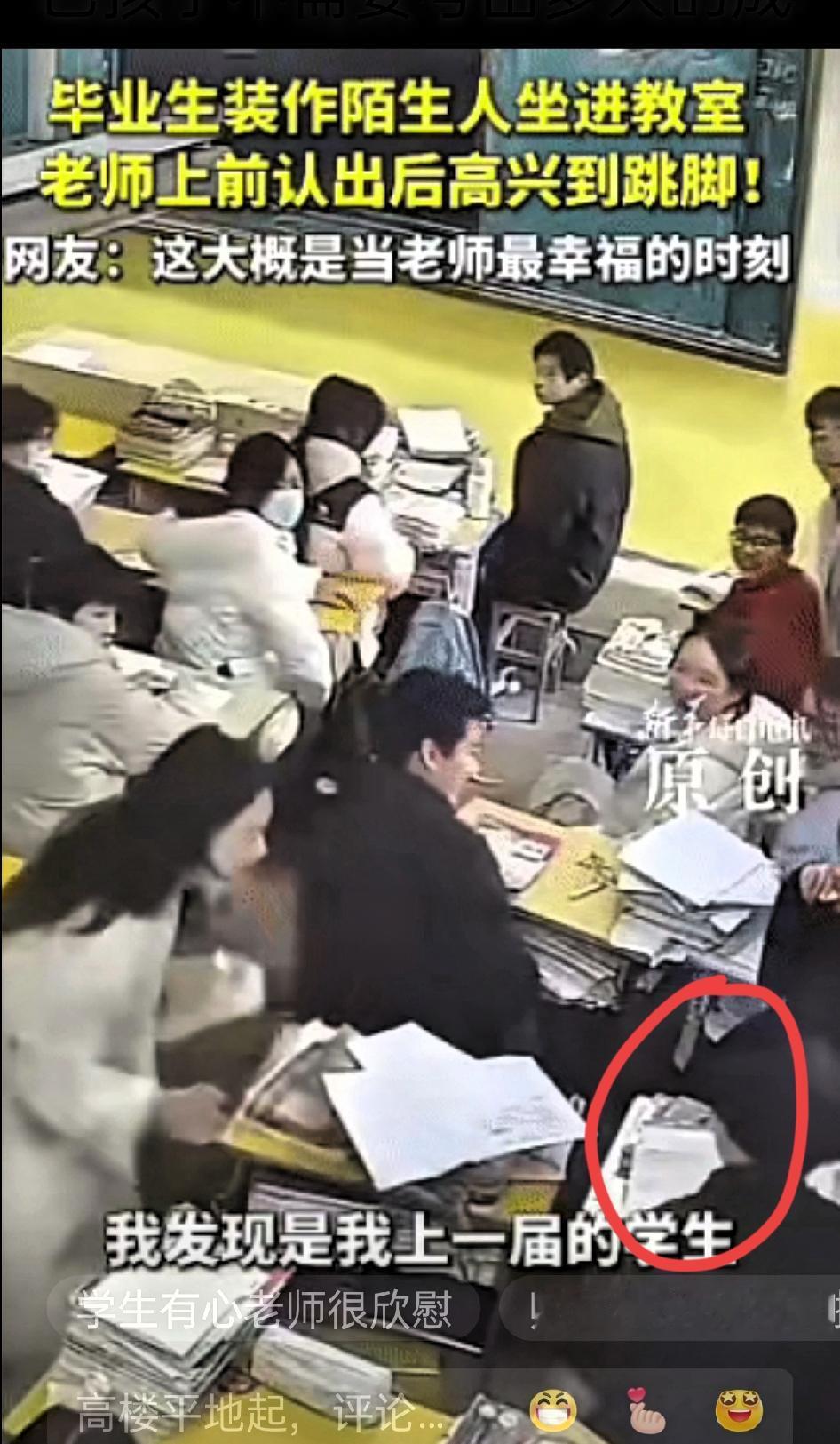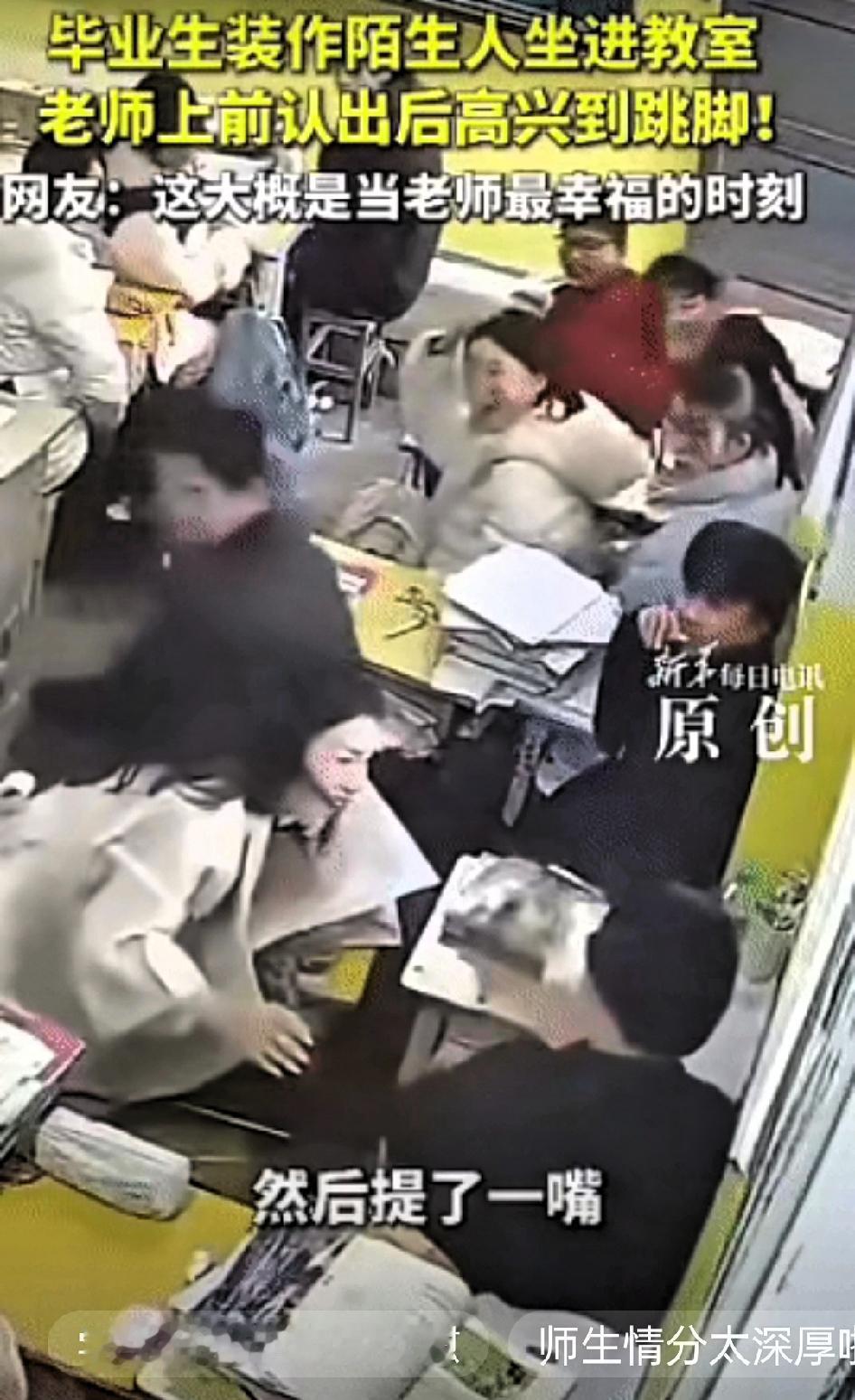 泪目了!江西,一名女老师听同学说,教室里来了一个陌生人,她满心疑惑地走过去查看,没想到对方一抬头,她瞬间愣住,紧接着开心得原地跳脚,眉眼间全是藏不住的笑意。 这个“陌生人”不是别人,正是她上一届最惦记的学生严子默。谁能想到,这份惊喜的开端,只是女老师半年前的一句随口念叨。当时她在班级群发了同学们以前读书的视频,顺带提了一嘴“有点想严同学了”,说者无心,听者却把这话牢牢记在了心里。 为了给老师一个惊喜,严子默特意选在1月14日这天,悄悄溜进老师现在的教室,找了个座位趴下来假扮陌生人。这一来一回的惦记,把师生情的温暖体现得淋漓尽致。 其实很多人毕业后,心里都装着曾经喜欢的老师,却总被各种理由绊住脚步。要么觉得自己当初成绩不好,没脸回去见老师;要么被工作生活的琐事缠身,抽不出时间回母校。可在老师的眼里,从来不会用成绩或者成就去衡量一个学生的分量。 比起你飞得多高、走得多远,老师更在意的,是你偶尔能回头看看,跟她说一句“老师,我来看你了”。一日为师终身为父,师生之间的这份情分,从来都不是单向的付出,而是双向的牵挂与奔赴。 老师的惦念,藏在课堂上的谆谆教诲里,藏在批改作业的红笔字迹里;学生的感恩,也可以藏在一次突然的探望里,藏在一句简单的问候里。 这份朴素又真挚的师生情,真的让人心里暖暖的。毕业之后,我们总被生活推着往前走,却常常忽略了那些曾经照亮过自己的人。