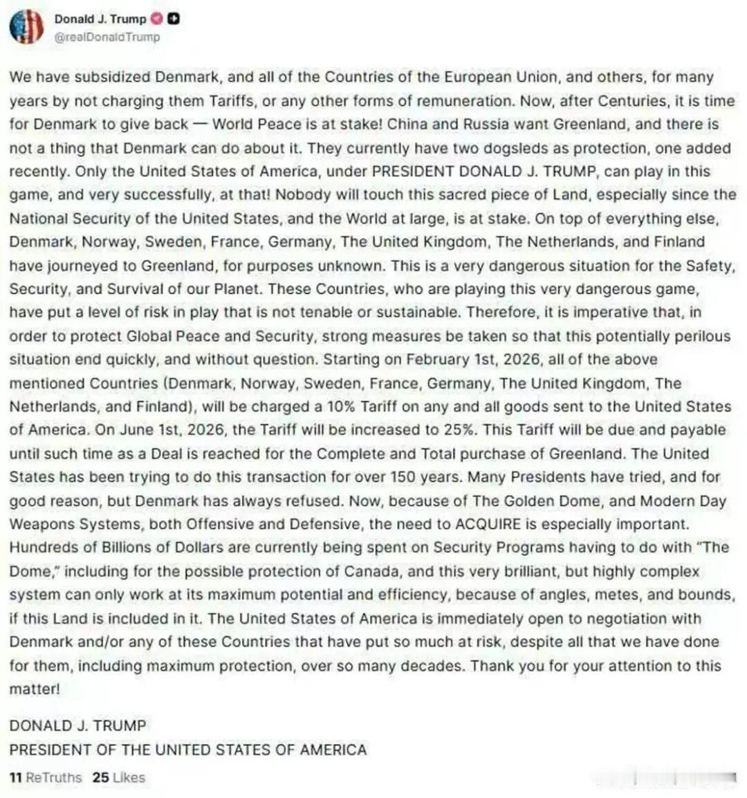 《华府圈内》昨天提到,特朗普威胁要给“不配合”美国获取格陵兰岛的国家加征关税。很快,他周六在Truth Social上发贴,就其多个方向上的议程再次强硬表态。他宣布,“为了保护全球和平与安全”,将自2月1日起对欧洲盟友——丹麦、挪威、瑞典、法国、德国、英国、荷兰和芬兰——的所有输美商品加征10%的关税。这一税率将于6月1日提高至25%,并将一直持续下去,直到达成美国购买格陵兰岛的协议为止。可以预见,欧洲方面势必会掀起一波强烈反弹。本周,欧洲多国领导人——以及昨天的美国国会议员——一直在试图向格陵兰岛居民保证,不会发生任何此类“入侵”行为,同时他们还在加紧加强该岛的防务能力。特朗普在贴文中表示,美国愿意同丹麦以及那些让局势面临巨大风险的国家展开谈判。 图片来源于网络