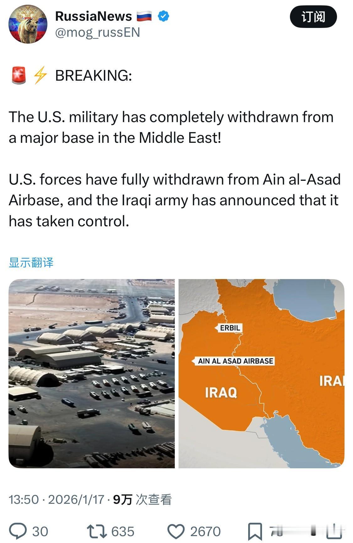 根据 2026 年 1 月 17 日的最新消息,美军已正式全面撤离位于伊拉克西部安巴尔省的阿萨德空军基地(Ain al-Asad Airbase)。 伊拉克国防部于 2026 年 1 月 17 日宣布,伊拉克军队已完全控制该基地。伊拉克陆军参谋长阿卜杜勒·阿米尔·拉希德·亚拉拉(Abdul Amir Rashid Yarallah)上将亲自监督了基地的接管工作。 此次行动是执行美国与伊拉克在 2024 年达成的协议。该协议规定,以美国为首的国际联盟将在 2025 年 9 月前开始逐步缩减规模,并计划在 2026 年底前完成撤军。 虽然美军及其装备已大部分撤离,但目前仍有极少数士兵因后勤处理暂时留守。此外,虽然阿萨德基地已交还,但美军在伊拉克库尔德地区(如哈里尔空军基地)及叙利亚境内仍保留有军事存在,以继续打击恐怖组织残余势力。 美国官方表示,由于伊拉克军队在打击“伊斯兰国”(ISIS)方面取得了重大进展,已具备独立应对威胁的能力,因此决定进行兵力整合与撤离。 此次接管标志着伊拉克在国家安全和军事主权自主性上的进一步增强。