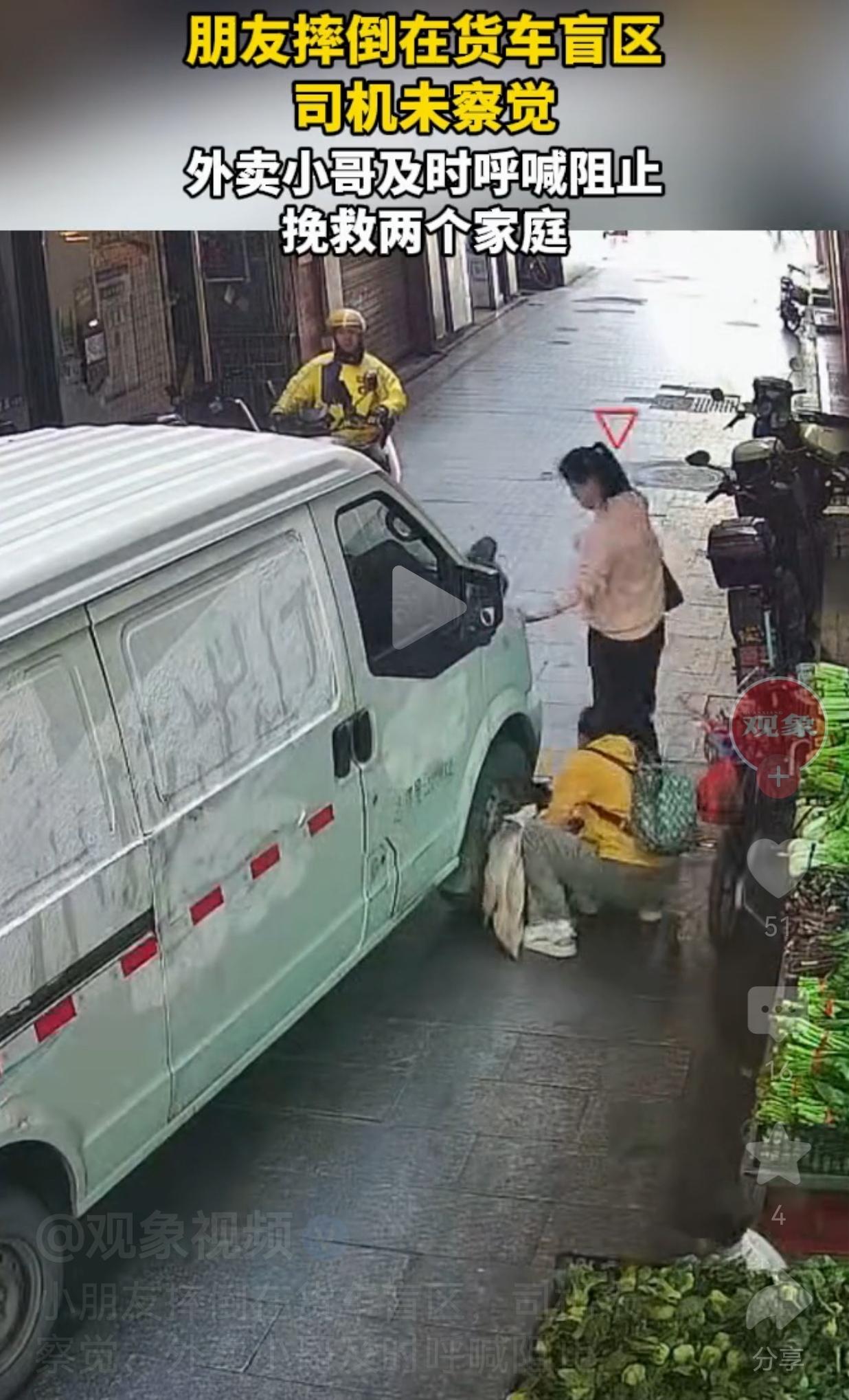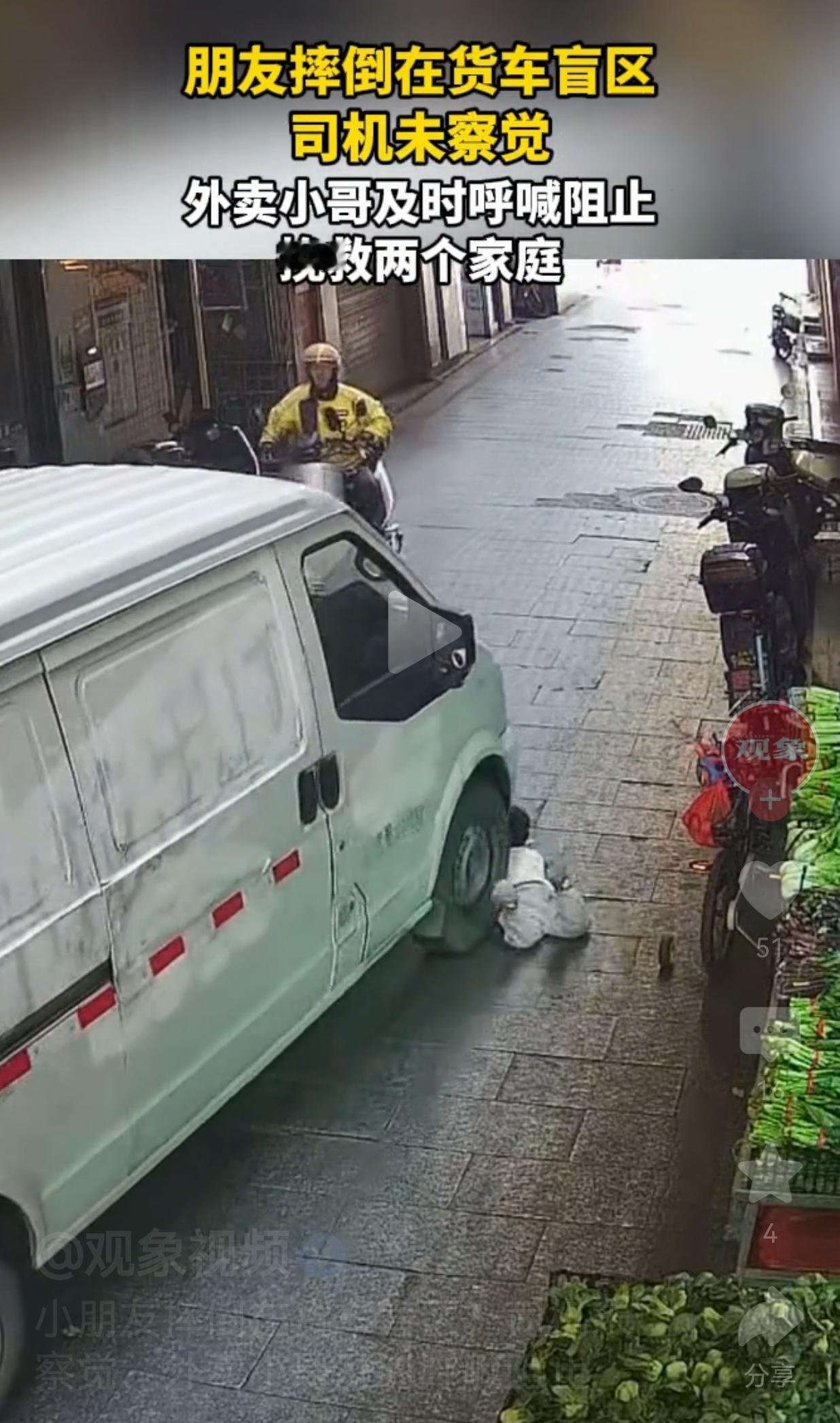 外卖小哥真的是一个伟大的职业!他们除了会送外卖之外,真的做了很多意想不到的好事! 1月17日,广东的一条老街上,一辆货车正在缓慢倒车。 谁也没注意到,两个小朋友正在玩耍,其中的一个小朋友跑着跑着,突然摔倒在货车右后方的盲区里,司机根本看不到孩子的情况视频中,眼看车轮已经快要碾到孩子。 就在这千钧一发之际,一位路过的外卖小哥猛地刹车,对着货车司机大喊:“停车!有人!” 司机听到外卖小哥喊声后立刻踩下刹车,孩子的妈妈听到声音,也第一时间冲过来把孩子抱走。 短短几秒,一场悲剧就这么被化解了。网友们纷纷感叹:“这小哥救了两个家庭!” 也有的网友说:“这一声吼太关键了!晚一秒都不敢想会发生什么事情!” 还有的网友说:“货车盲区真的太吓人了,家长跟孩子一起出门,一定要看好自己的孩子!” 外卖小哥本来只是路过,完全可以事不关己、高高挂起,但是他知道事情的严重性,因此,他没有犹豫,用一声呐喊救下了孩子的生命,也避免了司机背负一辈子的愧疚。 这就是普通人的英雄时刻,不需要惊天动地,只需要在关键时刻伸出援手。 这件事也给所有人敲响了警钟: 货车盲区是“移动的杀手”,尤其是在狭窄的街道,一定要和货车保持安全距离,家长带孩子出来玩耍,务必要看好孩子,不要让孩子远离自己的视线, 当然了,司机起步的时候,也要小心一点,慢一点,谨慎一点,要多观察后视镜,这样可能就会避免一场因失误而带来的悲剧。 话说如果当时你在现场,你会像这位外卖小哥一样,第一时间站出来吗?