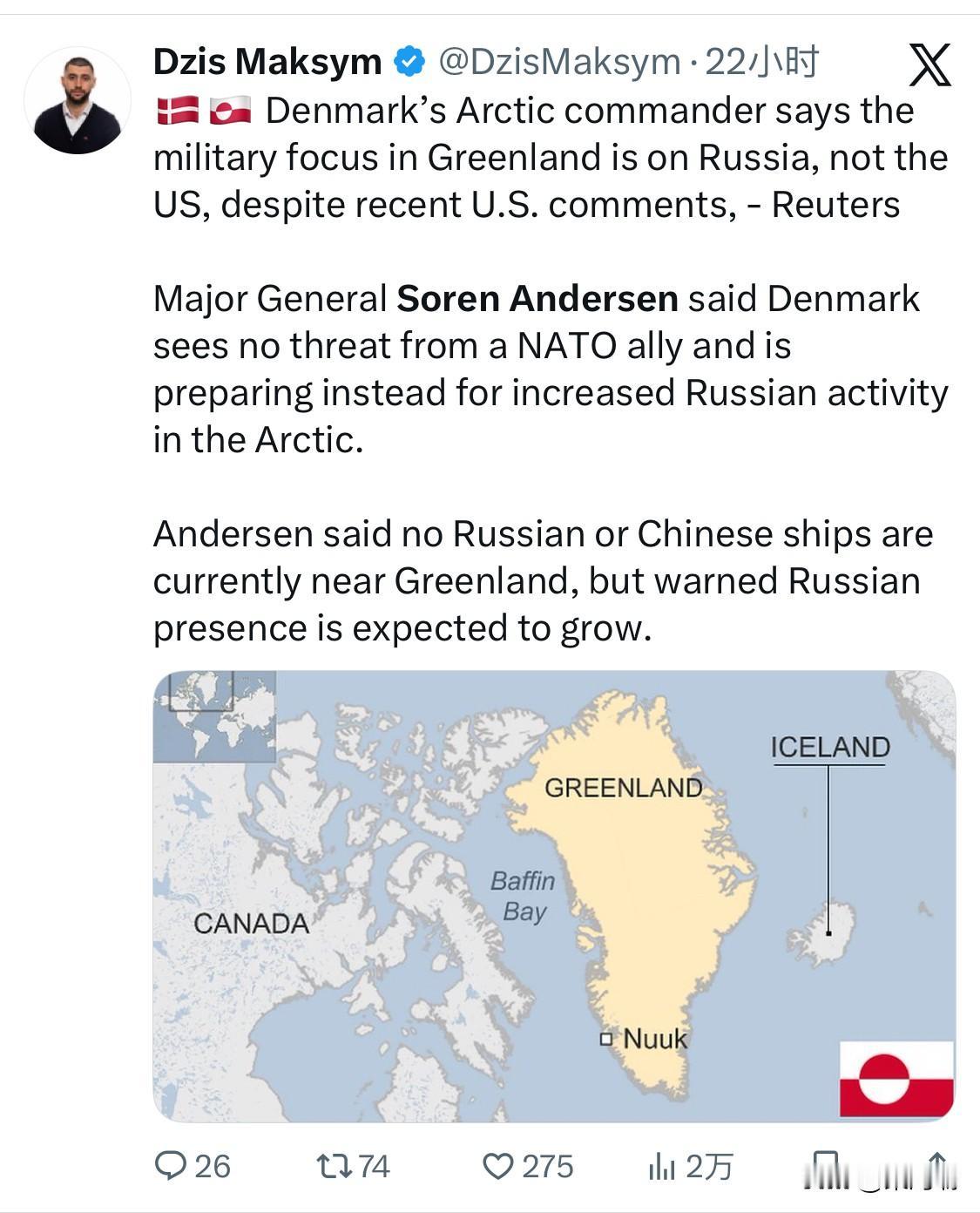 丹麦联合北极司令部(Joint Arctic Command)司令索伦·安德森(Soren Andersen)少将于2026年1月16日接受路透社采访时表示:“我的焦点不是美国,完全不是。我的焦点是俄罗斯”。他强调丹麦的任务是与北约一起保卫领土,并预计未来几年俄罗斯 在北极的活动将会增加。 安德森少将明确排除了北约盟友间发生冲突的可能性,称“北约盟友攻击另一个北约盟友”的情况只是“假设性的”。 丹麦国防部长特罗尔斯·伦德·波尔森(Troels Lund Poulsen)于1月14日宣布,丹麦将通过2026年全年的一系列演习和更大规模、更持久的北约存在,来加强在格陵兰岛的军事足迹。 这一声明发布时,正值美国总统特朗普重申对格陵兰岛的领土意向,引发了丹麦、格陵兰与美国之间的紧张关系。尽管美方对格陵兰的防御能力表示质疑,但丹麦官员通过增加在该地区的军事活动,意在展示其与欧洲盟友共同维护主权和北约北翼安全的能力。