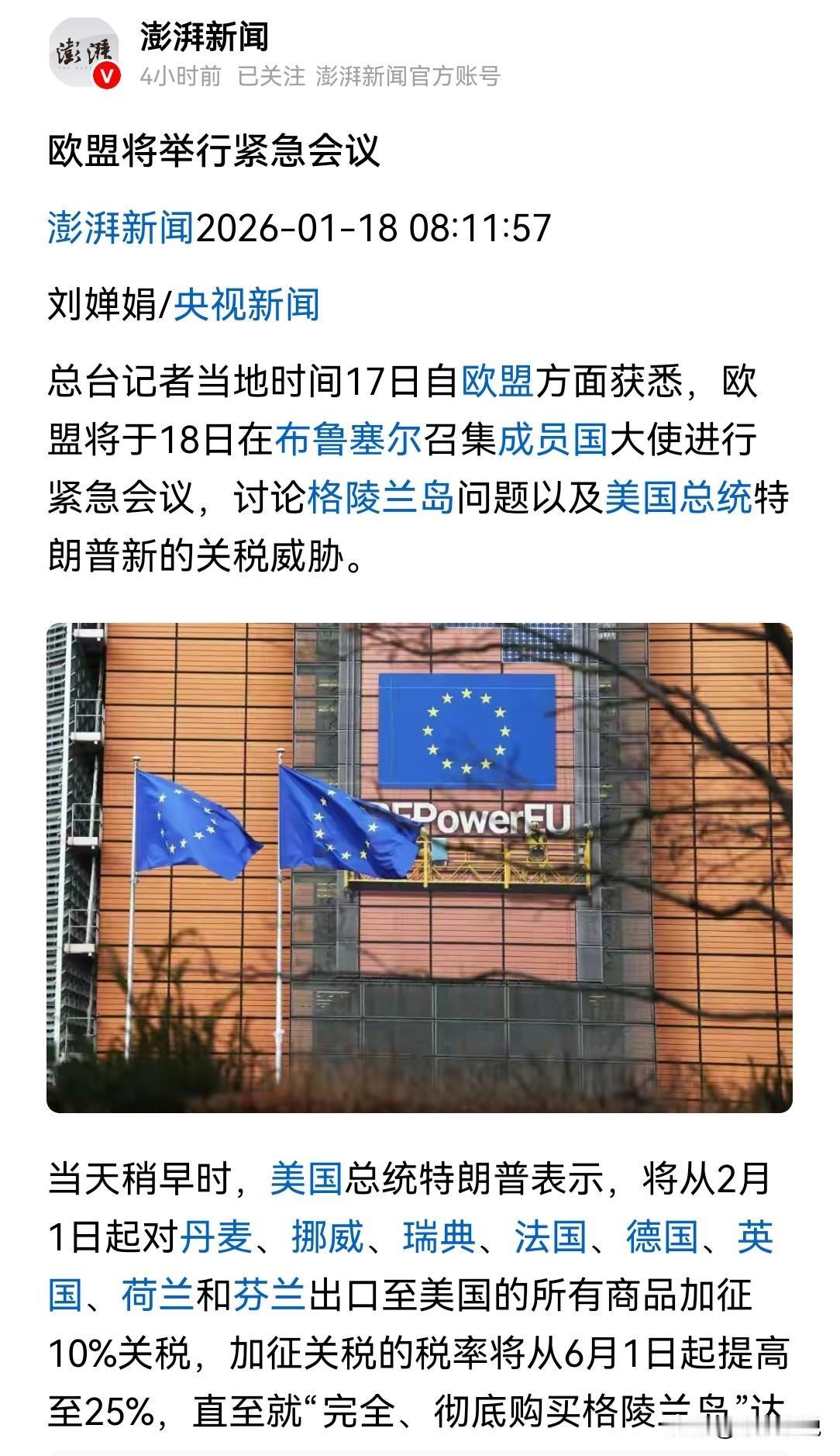 欧盟制裁中国的时候,中国可没有欧盟今天这么狼狈 就在昨天特朗普宣布向不支持美国获得格陵兰岛的8个欧洲国家加征关税后,欧盟于今天开始召开紧急会议,而会议的内容就是商讨怎么应对美国和特朗普的威胁。 然而欧盟跟随美国制裁俄罗斯的时候可比现在要从容得多了,而且欧盟跟随美国脚步对中国半导体产业还有新能源汽车产业进行制裁的时候,中国可没有今天欧盟这么狼狈。