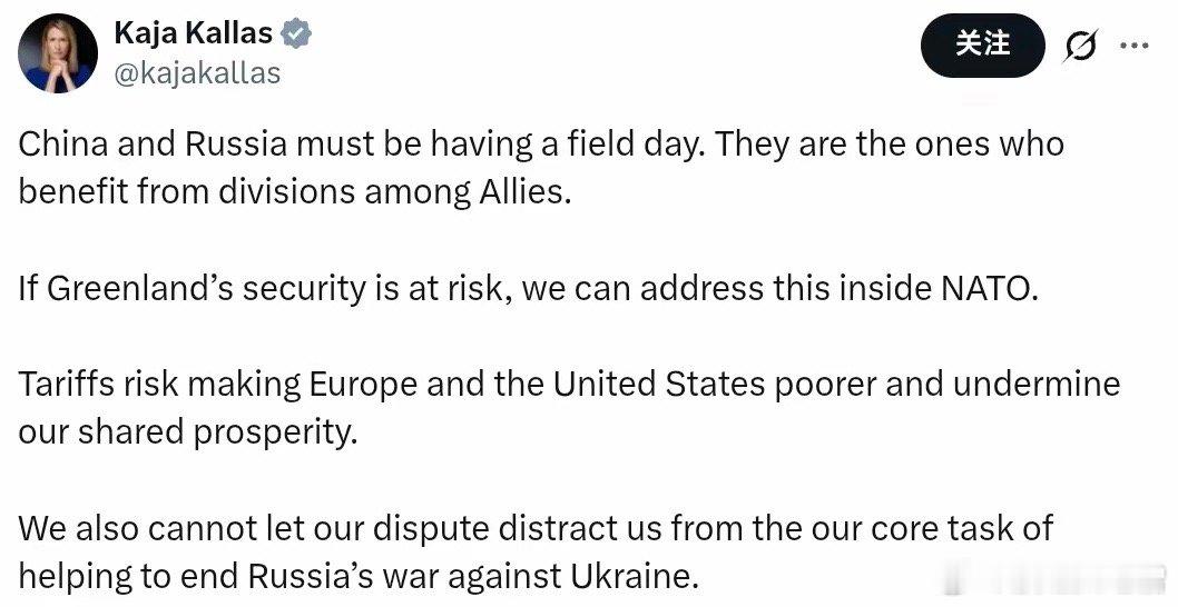 欧盟外长卡拉斯18日在社交媒体发文:美国对格棱兰岛主权的索取,中国和俄罗斯在开香槟酒庆祝。并提醒美国盟友之间关系很重要,绝对不能破损,我们有共同的价值,盟友之间信任是对付威权第一要务!欧州政客的头被门夹子,任由一群女人胡来,女人当家房垮屋塌,牝鸡司晨不务正业,难怪欧州这样争着自残,可悲!