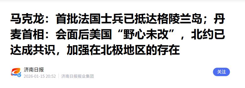法国总统马克龙宣布。 1月15日,法国总统马克龙宣布了一个令人惊讶的消息,首批法国士兵已经抵达遥远的格陵兰岛,未来几天还会有更多士兵赶过去,其实不止法国,德国也派了一支13人的小队,瑞典也确认会派兵,好几个欧洲国家突然都对这片冰天雪地感兴趣了。 格陵兰岛虽然归丹麦管,但最近几年可成了“香饽饽”,为啥?因为这地方太重要了! 名义上它是丹麦的自治领地,有高度自治权,也就国防和外交还归丹麦政府统筹,可论战略价值,早就超出了普通自治领地的范畴。这岛面积足足216万平方公里,是世界最大岛屿,一半在北极圈里,一边靠着北冰洋,一边连着大西洋,刚好卡在欧洲和北美之间,妥妥的“两洋十字路口”。 随着全球变暖,北极冰盖加速融化,以前常年冰封的航道慢慢能通航了,这条北极航道能大幅缩短欧洲到北美、亚洲的航运距离,比传统航线省不少时间和成本。过去十年里,符合极地航行标准的船只在这片水域的通行量涨了37%,格陵兰岛正好处在航道关键节点,谁能掌控这里,谁就攥住了北极航运的主动权。 更实在的是这岛底下藏着的宝贝。美国地质调查局的数据显示,格陵兰岛的稀土储量高达150万吨,要知道现在造芯片、新能源设备、军工产品都离不开稀土,全球都在抢这玩意儿。除此之外,还有175亿桶未开采石油和4.15万亿立方米天然气,以前冰盖太厚没法挖,现在冰化了,开发难度越来越低,这简直就是北极圈里的“资源宝库”。 欧洲各国突然集体往这派兵,表面看是凑热闹,实则全是被局势逼的。首当其冲就是美国的小动作不断,特朗普最近又翻出了“收购格陵兰岛”的老调调,还放话不是租赁也不是短期管控,是要彻底纳入美国版图,甚至直言“不抢就被俄罗斯抢了”。这话听着离谱,却戳中了欧洲的神经——美国早就在岛上有军事基地,也就是以前的图勒空军基地,现在改名皮图菲克太空基地,一直在加码投入强化威慑力。 欧洲各国心里门儿清,美国要是真把格陵兰岛攥在手里,不仅北极航道的话语权没了,连欧洲北部的安全防线都要被美国拿捏。德国先派13人小队打头阵,说是摸底极寒环境下的作战适配性,实则是抢占有利位置,紧接着法国直接派大部队进驻,瑞典也紧随其后,本质就是抱团跟美国掰手腕,告诉外界北极安全轮不到美国独断。 俄罗斯的北极布局也让欧洲不敢掉以轻心。这些年俄罗斯一直在强化北极军事存在,欧洲担心一旦自己缺位,北极的战略平衡会被打破。英国之前就牵头跟挪威、美国在北极圈搞联合演习,检验极寒地区的兵力投送能力,现在法德瑞直接驻军格陵兰岛,也是跟英国的动作形成呼应,筑牢欧洲在北极的军事存在。 有意思的是,丹麦和格陵兰岛本地的态度也很微妙。格陵兰岛刚办完自治议会选举,独立议题被炒得火热,美国的强硬表态反而让当地民众对外部干预更警惕。丹麦一边要应付美国的施压,一边又得顾及欧洲盟友的诉求,只能在外交上反复协调,试图稳住局面。毕竟对丹麦来说,格陵兰岛的自治权不能丢,也不想彻底得罪欧洲盟友,更不敢跟美国硬刚。 欧洲多国这波操作,说白了就是抢时间、占位置。格陵兰岛的价值会随着北极冰盖融化越来越高,现在每一步布局都是为了未来的话语权。美国想凭实力独吞,欧洲想抱团制衡,俄罗斯也在旁边虎视眈眈,这片冰天雪地早就不是无人问津的荒原,成了大国博弈的新舞台。 法国士兵的进驻只是开始,后续肯定还有更多国家跟风动作。格陵兰岛名义上还是丹麦的自治领地,可实际已经成了各方势力角力的棋盘,至于最后谁能在这片冰原上占据上风,还得看各方的拉扯和妥协,但可以肯定的是,北极的竞争只会越来越激烈,这片寂静的冰原再也没法平静了。