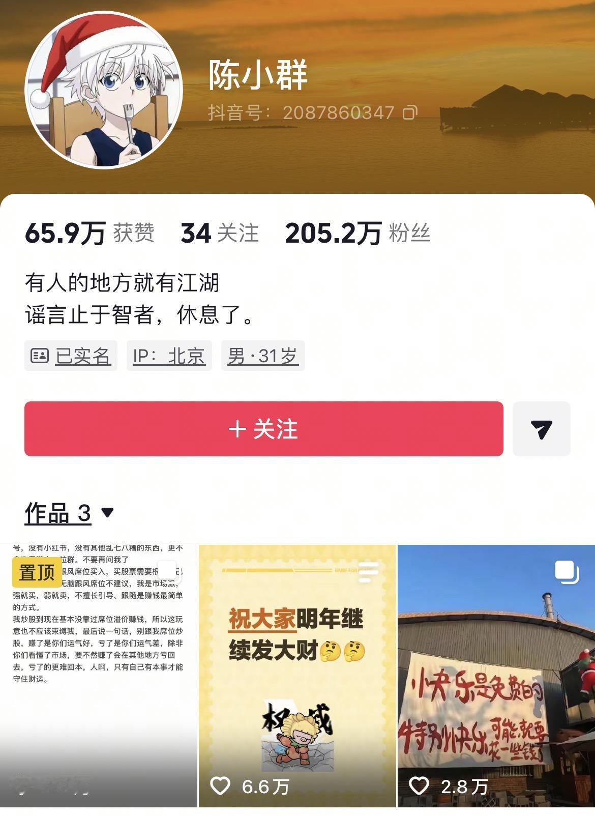中国慈善家杂志:顶级游资陈小群捐1000万元建希望小学 网友:90后游资典范,亲自践行什么叫“达则兼济天下”[赞] 目前,他在社交平台上仅更新三条视频,便吸引了超200万粉丝,其投资心法与动向成为网友关注的焦点。