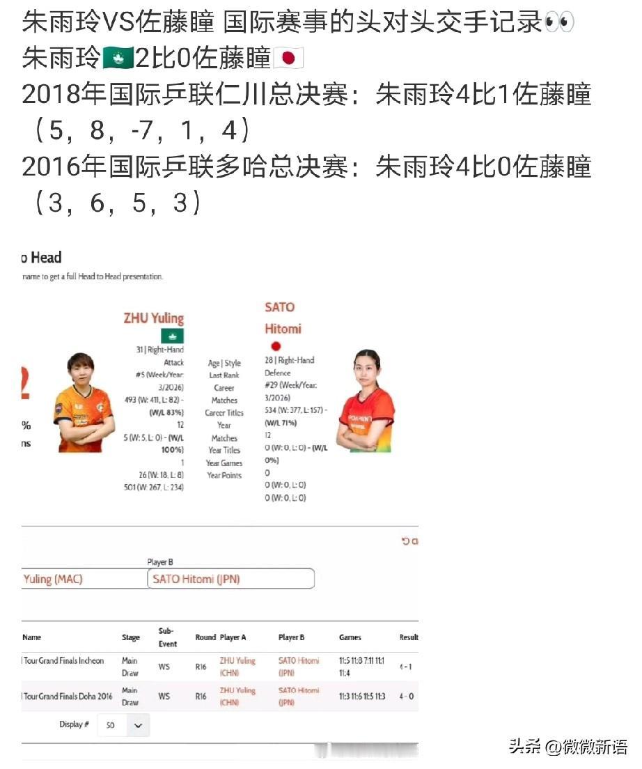 恭喜朱雨玲晋级女单决赛。 多哈冠军赛朱雨玲是刚刚拿了女单冠军,这一站多哈球星挑战赛朱雨玲又打进决赛了,新的一年,有了陈振江教练陪着她一起比赛,状态也不一样了。 在刚刚结束的女单半决赛中,朱雨玲是3-2战胜了大藤沙月,在决胜局时大藤沙月是10:9先拿到赛点,然后朱雨玲是连拿3分,以12-10赢下决胜局,大藤明显后面打得越来越不坚定,朱雨玲心态还是要稳一些。 每次局间的时候,陈振江教练都是让朱雨玲坐在那里休息,看到朱雨玲的腿上也打着肌贴了,肯定连续比赛腿也会有反应。陈振江教练从国乒退休后,就和朱雨玲合作了,他们俩时隔十五年再续师徒缘,女单决赛朱雨玲加油! 这次比赛,日乒削球手佐藤瞳是一路打进决赛,看了一下朱雨玲和佐藤瞳的交手记录,在以前两个人有过两次交手,时隔八年,两个人将再次交手,相信朱雨玲的解题能力,希望她能再次夺冠!