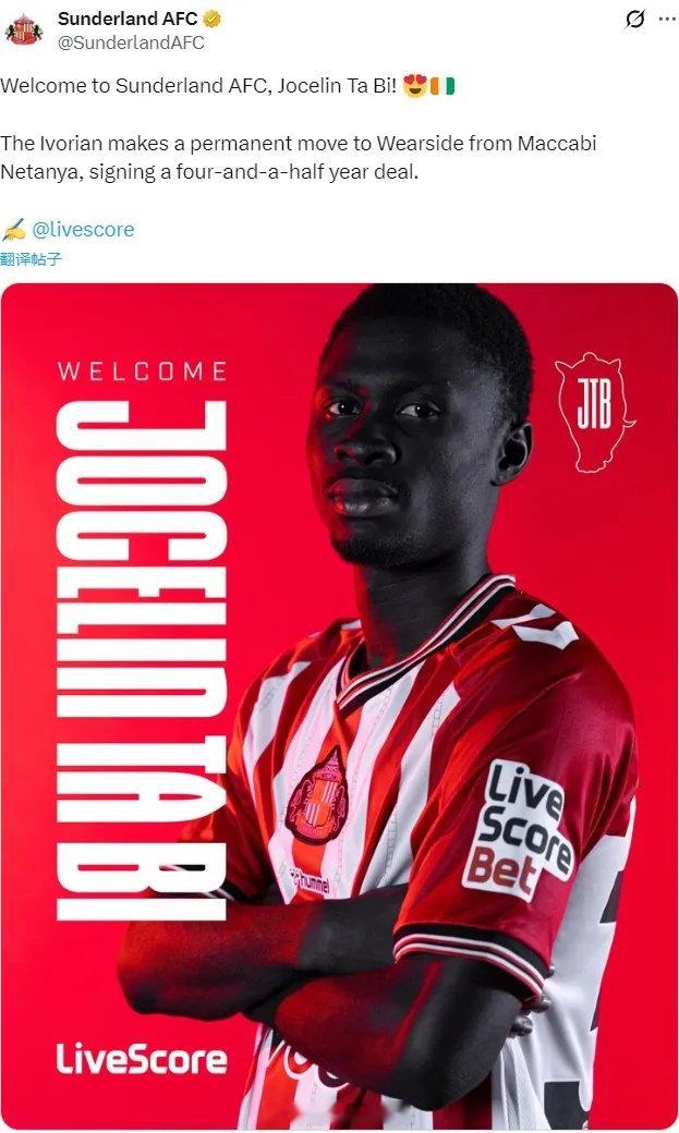 官方:桑德兰宣布从内坦亚马卡比俱乐部签下了塔比,这名20岁的边锋签下了一份为期四年半的合同,附带延长一年条款。据悉这笔交易价值300万英镑。