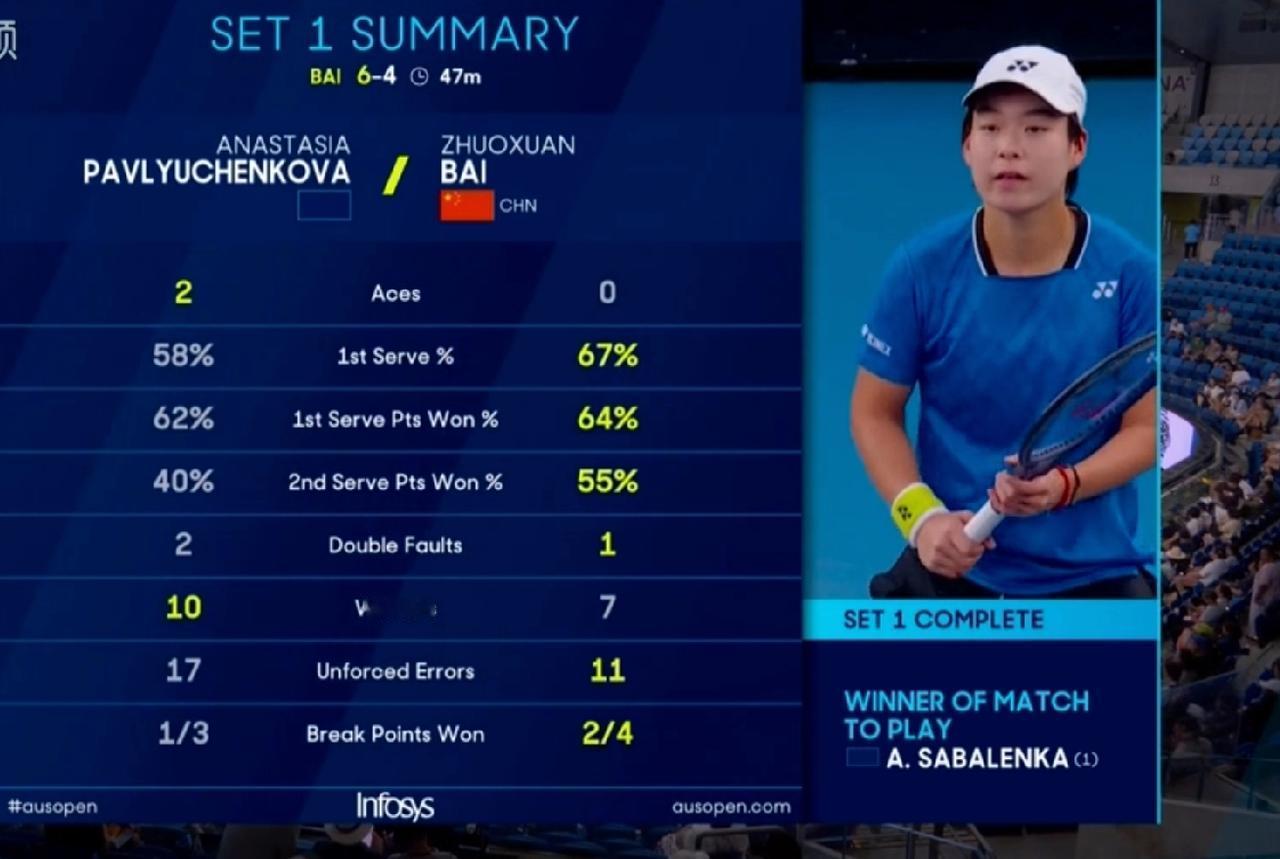 12-10,小白爆冷创澳网个人最佳战绩! 23岁的白卓璇在2026澳网女单正赛首轮就给大家带来惊喜,2-1击败帕夫柳琴科娃。小白整场比赛表现的可圈可点,不管是盘分还是局分或者是抢十,帕夫柳琴科娃大部分时间基本处于追分的一方,这是小白继2023年温网后第二次突破大满贯首轮。 首盘比赛,白卓璇打的灵巧快,2-2平分后连赢三局,拿到三个盘点,虽然帕夫柳琴科娃盘末疯狂反扑,但最终小白成功压制对手,以6-4先下一城,第二盘,帕夫柳琴科娃增加上网机会,长短结合,以6-2扳平大比分。双方进入决胜盘后比分非常胶着,小白率先破发,2-0处于主动,但随后对手状态回升,6-6追平比分进入抢十,抢十阶段小白发挥出色,以12-10拿下比赛,晋级第二轮。
