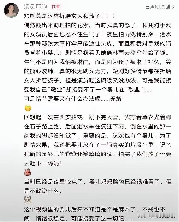 怎么可以这样呢?让几个月大的婴儿在伞外淋雨! 为了短剧的效果,为了收视率,连小生命都不顾了吗?人家只是一个婴儿而已啊! 某演员在公开网络上吐槽,说主办方总是为了达到某一种效果,而折磨女人和孩子,让婴儿在外淋雨,孩子的妈妈脸色很难看,但是不敢上前阻止,也不敢说什么。 孩子的妈妈脸色能不难看吗?10月怀胎生下的孩子,让你们这样子在伞外淋雨,不敢上前阻止,也不敢说什么,是因为答应了的事情就要做到,说明孩子的妈妈内心是善良的。 但是善良归善良啊,不能这样子欺负人家小孩子呀! 给人家的片酬只有800块,却让人家淋了那么久的雨,如果因为这场雨婴儿生病了,恐怕花销都不止800块了吧? 现在口袋里面没有1000块钱,都不敢跨到医院里面,只要一块进去,这心电图检查呀,拍个照啊,血液检查呀,光这几样都去几个百,再抓点什么中药西药啊,1000块钱也花的差不多了。 这么小的婴儿,如果淋了雨就发烧,住院的话,恐怕没有三四千块是搞不定的吧? 真是太生气了,能这样子对待一个婴儿,想必也是没有多大的责任心,也没有什么同情心的吧!