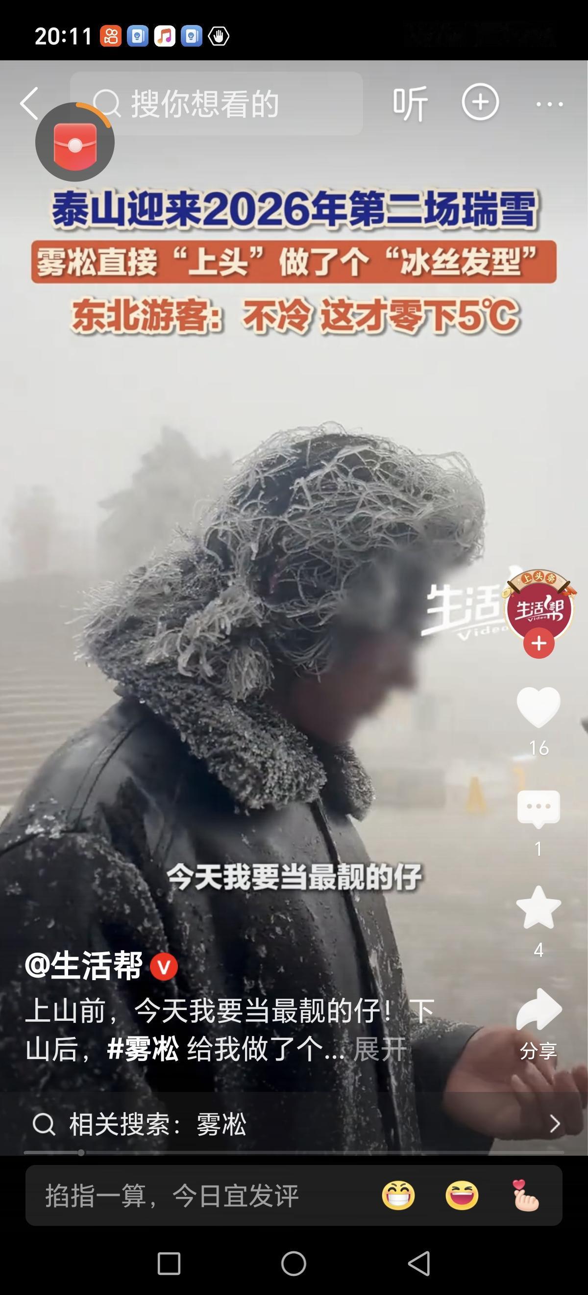 泰山雾凇给游客做了个“冰丝发型” 一小伙冬天爬泰山,登顶后头发全结满了冰晶,根根直立像炸开的钢针,活脱脱一个“白发魔男”。面对镜头,他苦笑着说:“梳都梳不动。”这场景,不禁让人会心一笑,但背后却藏着更深的意义。 泰山,这座被誉为“天下第一险”,不仅以雄伟壮丽的风光吸引无数登山者,更以它每年冬天的“冰雪奇观”成为自然界的奇迹。雾凇如同大自然馈赠的银装素裹,将山顶变成了童话世界。而这位小伙子,只是众多被“冰封”的游客中的一员。有人说,他“幸运”遇上了如此奇景,也有人调侃他“倒霉”被冻成了“人形雕塑”。 然而,站在更高的角度看,这样的体验其实是一面镜子,映照出我们对自然的敬畏、对挑战的勇气。有人在评论区吐槽:“这也太惨了吧,头发都要被冻碎了。”但也有人感叹:“这是真正的勇敢,要知道,很多人只敢在温暖的室内看风景,真正走到极限的人,才懂得自然的威严与美丽。” 人性就是如此:在面对未知和困难时,我们既恐惧,又渴望突破。那位“白发魔男”,用他的“冰发”告诉我们,只有敢于迎接极限,才能真正感受到自然的震撼与奇迹。也许,这就是登山的意义——在艰难中发现自我,在挑战中激发潜能。 更令人深思的是,现代社会中,我们习惯了舒适与便捷,却渐渐淡忘了那份面对困难的勇气。泰山的雾凇提醒我们:每一次极端的体验,都是生命中难得的洗礼。即使“梳都梳不动”,那也只是暂时的。自然的力量会让我们变得更坚韧,更懂得珍惜每一份平凡的美好。 所以,下次当你看到朋友圈里有人晒出“被冻成冰雕”的照片,不妨多一份理解与敬意。因为他们用行动告诉我们:人生的精彩,正是在不断的突破与挑战中绽放。泰山的雾凇,或许只是一个冰冷的奇景,但它激励我们,勇敢面对生活中的“寒冬”,迎来属于自己的春天。 让我们都记住:无论风雪多烈,心中的那份热情永不凋零。因为,真正的勇士,不是没有恐惧,而是敢于在恐惧中前行。泰山的“冰丝发型”只是一个开始,未来的路上,愿你我都能像那位“白发魔男”一样,迎难而上,活出最精彩的自己。泰山极顶雾凇 泰山顶雪景