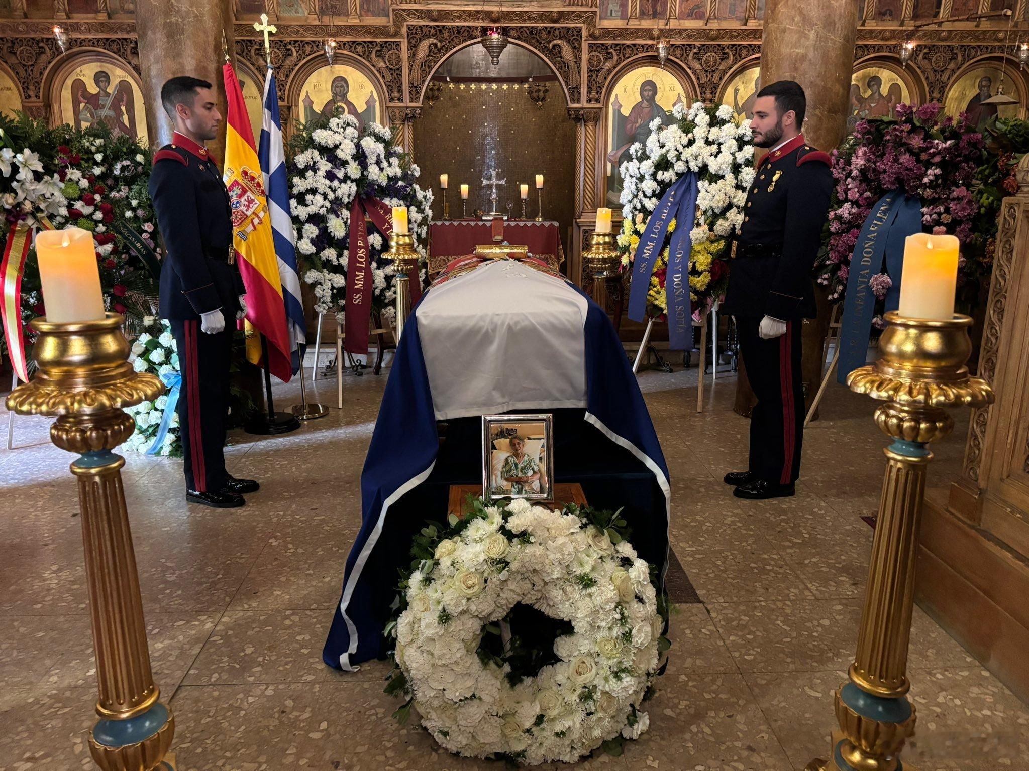 希腊王室艾琳公主在马德里告别仪式上,她的灵柩上摆放着两条勋章是索菲亚王后特地要