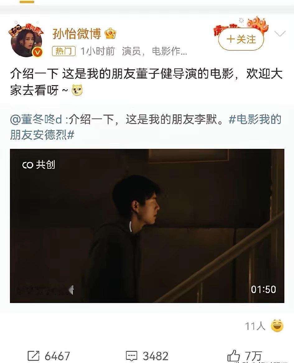 董子健回复孙怡作为董子健的前妻,孙怡大大方方地在微博为他捧场。“介绍一下,这是