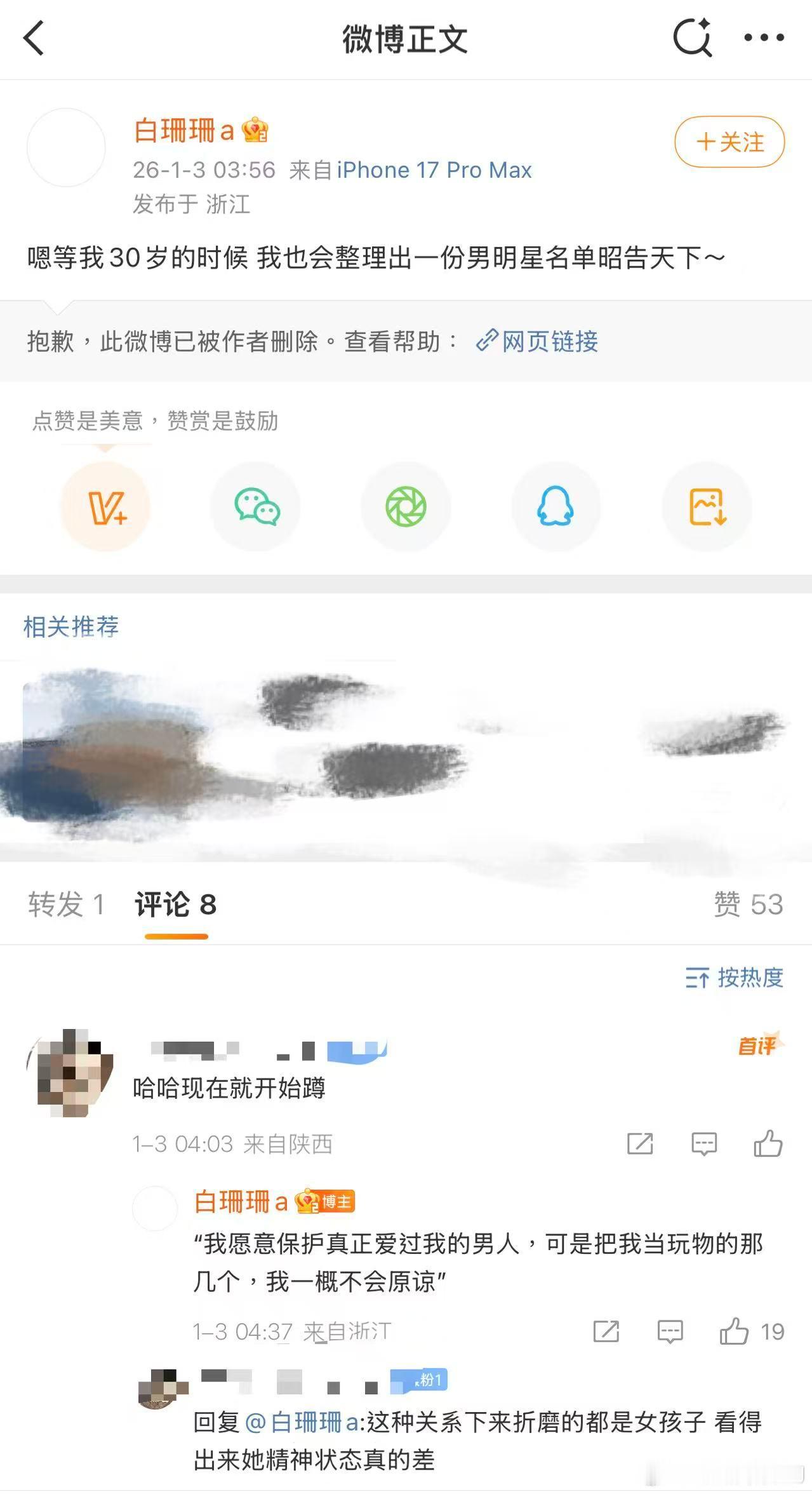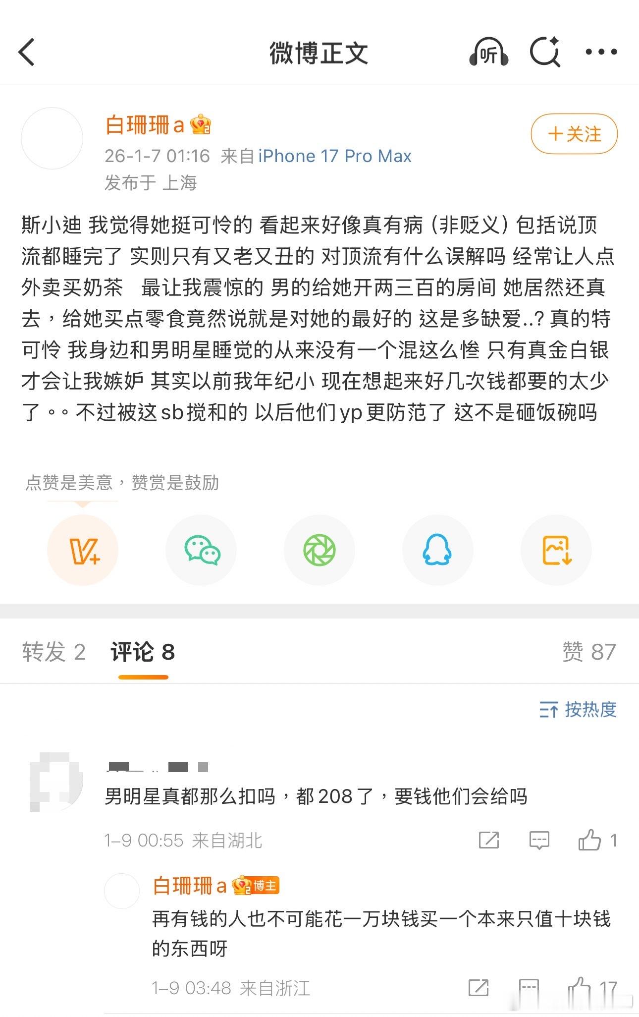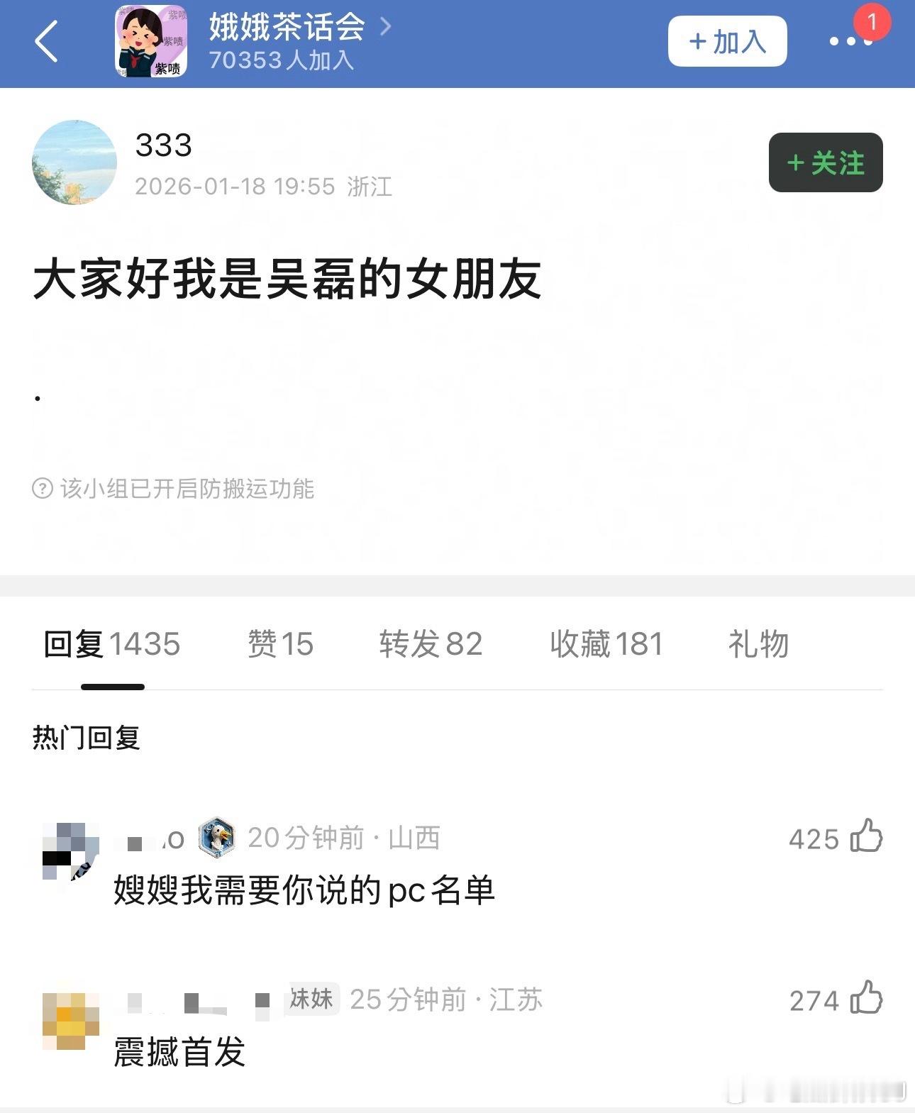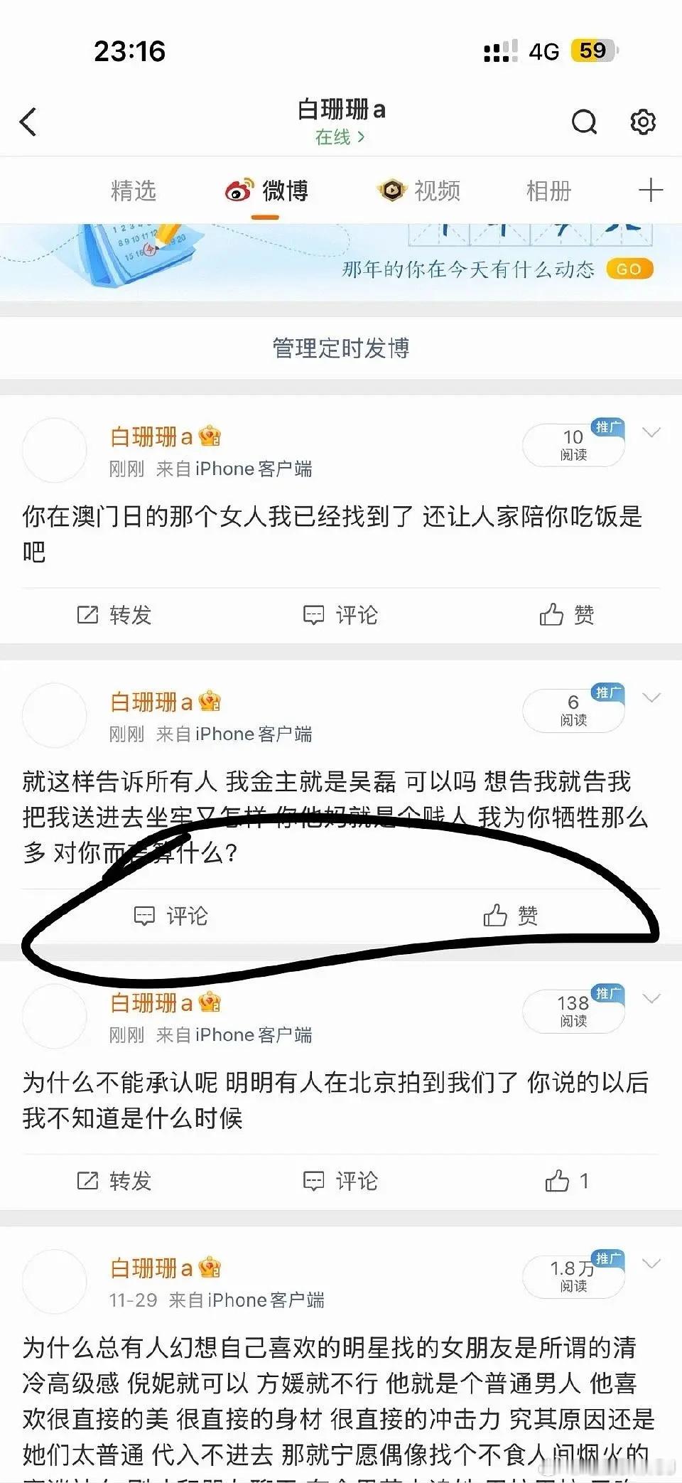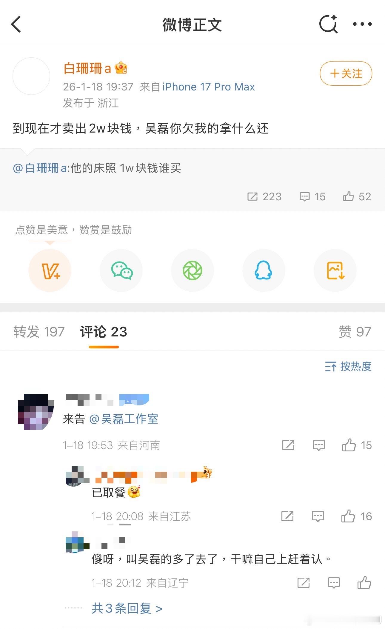 有个叫白珊珊的网友同时在微博和豆瓣发帖,说自己是吴磊女朋友,还要1w块钱卖床照。白珊珊 吴磊你欠我的拿什么还已知内娱有好几个吴磊,刚刚演员吴磊工作室发声明否了,“恶意捏造”“毫无事实依据的谣言”,要追究到底绝不姑息。