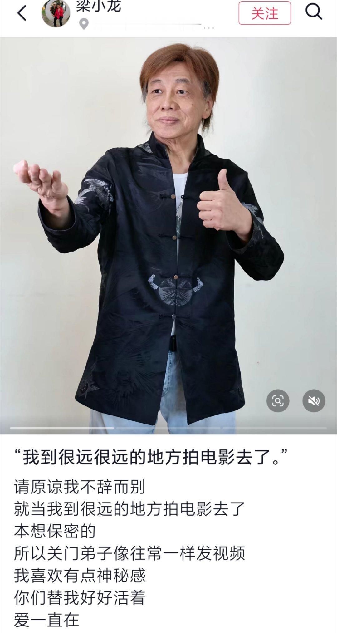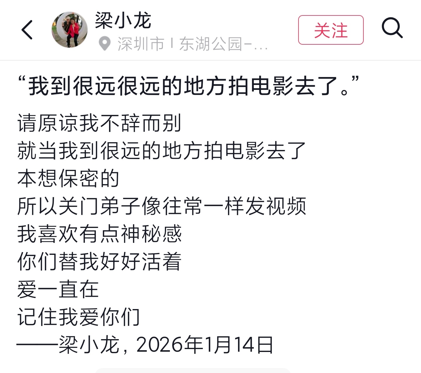 【梁小龙社交账号发文告别】梁小龙账号发文回应为何持续更新梁小龙本想保密的梁小龙的账号发文:“我到很远很远的地方拍电影去了。”请原谅我不辞而别 就当我到很远的地方拍电影去了 本想保密的 所以关门弟子像往常一样发视频 我喜欢有点神秘感 你们替我好好活着 爱一直在 记住我爱你们 ——梁小龙,2026年1月14日
