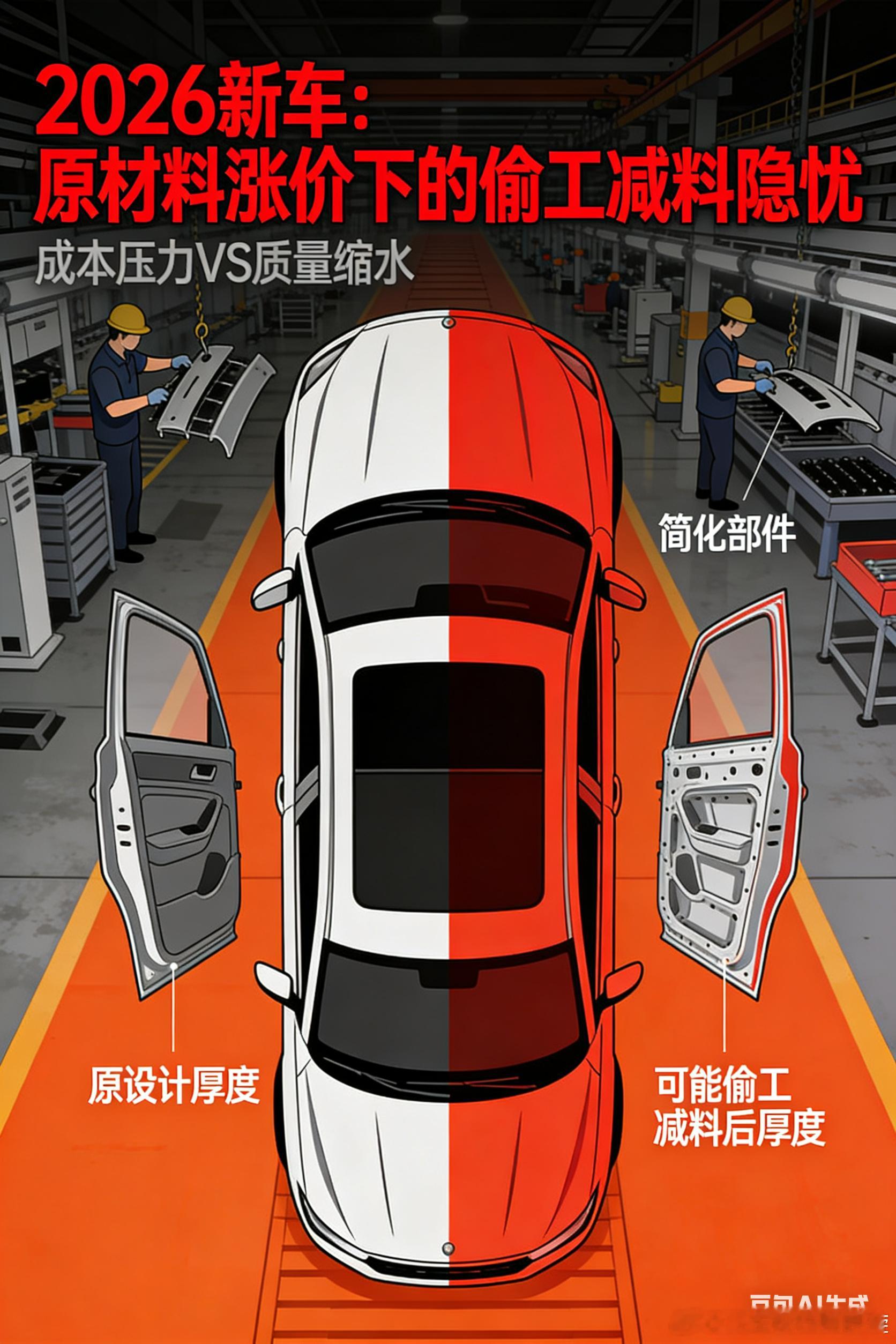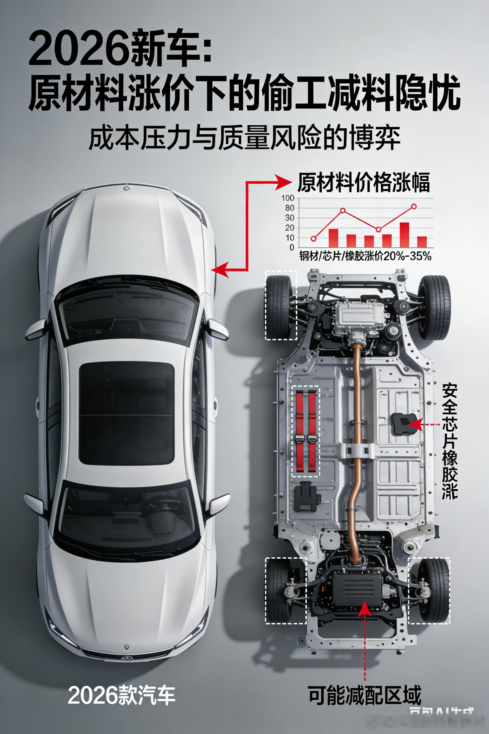 避坑:2026年原材料涨价,选车重点关注哪些偷工减料?BY【工科女的车库】2026年选车,别盯着“多了什么”,要盯“没少什么”!铜、铝、存储芯片、白银、工程塑料、天然橡胶、碳酸锂都集体涨价,车企既要升级产品,又要保性价比、赚利润,太难了,看不见的地方偷工减料,估计大慨率。今天就基于公开材料成本数据与工程逻辑,聊聊可能的减配路径和清单,我们只摆事实,不制造焦虑,但求帮你练就 “防减配火眼金睛”。最好保存收藏。首先,涨价原材料多在线束、电机、电子系统、车身/内饰、安全配置等环节。先看线束与电机,这是最容易动手脚的。宣传页吹得天花乱坠的“全铜配置”,实际可能暗度陈仓换成铜改铝、铜包铝。铜改铝省30%成本,换来半路抛锚风险!因为未经技术改良的铜换铝,高温天极易断芯。鉴别方法很简单:试驾时猛踩油门测高速动力,全铜电机爬坡不脚软,而铜包铝十分钟就热衰减。这里必须敲黑板提醒燃油车车主:别以为燃油车没电机!车窗升降、座椅调节、雨刮摆动、转向助力,全靠小电机,减配任何一个,用车体验直接降档。之前就有燃油车怠速抖、加速肉,4S店查不出原因?后来查出是燃油泵电机减配;还有网友经常说高速行驶发飘吓出一身冷汗?没准是电子助力电机的偷工减料。重头戏在铝材减配,2026开年“铝慌”来袭,矿少厂停库存空,电解铝成本飙升,车身结构和底盘悬架的影响估计首当其冲。曾经象征操控尊严的铝合金悬挂,可能上演“铝换钢”魔术:控制臂、转向节从银白铝合金换成黑色钢板,再喷一层银色铝粉掩人耳目,磁铁一吸,真相立现。代价就是悬挂反应迟钝,颠簸余震层叠,仿佛穿铁鞋跑步。更隐蔽的减配在细节里:液压衬套降级成廉价橡胶疙瘩,过减速带时有生硬的撞击感,就是车企省下成本的“回声”;防撞梁从铝合金或高强度硼钢,换成薄钢板甚至工程塑料,部分车型直接取消行人保护防撞梁;底盘护板消失不见,美其名曰“方便维修”。更有胜者,刹车系统也可以“化妆术”。红色卡钳不一定就猛,可能只是“卡钳罩cosplay”!拆开轮毂才发现,硕大的四活塞标识背后,竟是单活塞加个外壳滥竽充数。刹车盘厚度缩水、通风槽变窄,每辆车省几十元,百万销量就是千万级利润,受伤的却是车主的刹车安全。另外,存储芯片涨价,让智能汽车的“预埋算力”成为泡影。不少车型标配激光雷达撑场面,却悄悄把两颗Orin芯片减成一颗,或改用低算力国产芯片,美其名曰“够用就好”。预埋算力没了?今天够用,明天OTA直接锁死!这就像买手机,从前256G留足升级余地,现在128G靠算法勉强凑活,短期内功能看不出差别,未来你的车提前沦为“智障车”。更要警惕毫米波雷达减配,这可是恶劣天气的安全屏障,少了它,暴雨大雾天极有可能出现识别故障。轮胎和轮毂的减配套路同样深:宣传高性能轮胎,实车却配杂牌低滚阻胎;轮毂从铝合金降级成钢圈加塑料盖,还敢标注“铝合金轮毂样式”;备胎从全尺寸缩水成小尺寸,甚至直接消失,只给一瓶补胎液敷衍了事。最后是那些看不见的细节减,碰撞测试不敢造假,但“非测试区”早已布满猫腻。车漆变薄、接缝变大,都是减配的“小暗号”!多层喷涂简化成“三涂一烘”,新车阳光下光鲜亮丽,三年后黯淡无光、龟裂掉漆;车身接缝变大且不均匀,关门得用足力气,根源是焊接点减少、结构胶用量降低,一体式门框换成拼接式,靠装饰条掩盖缝隙;引擎盖内隔音棉缩减一半,机舱噪音直钻车内,车企却宣传“运动感声浪”。如果你发现这些小细节,多半是减配了:发动机舱莫名“空旷”,隔热材料减少了、排气管隔热瓦从全覆盖变局部覆盖;变速箱冷却管从金属换成塑料;仪表台搪塑材质换成硬塑料;座椅皮革从真皮降级为超纤皮,车窗升降按键从镀铬金属变成塑料喷漆;防腐工艺从空腔注蜡变成局部喷涂,螺栓防锈从达克罗工艺换成普通电镀。这些减配不会让你买车当天就抛锚,却会让你的车在第五年就到处异响、四处渗漏,小毛病修不完。好了,2026年的车市,就是一场“看得见的配置”与“看不见的成本”的极限拉扯。记住:选车时,切记:不要问它多了什么,而要特别关注:它少什么。