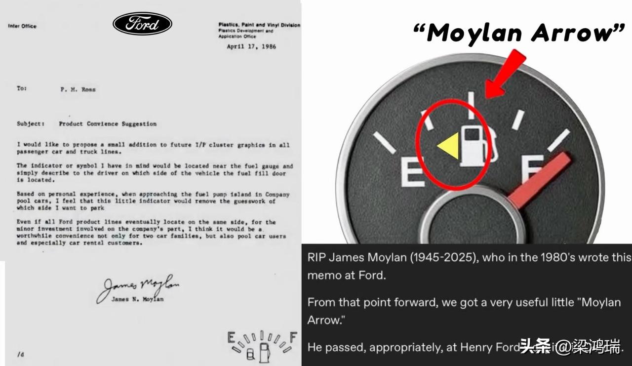 不知网友有没有注意每一辆汽车油量表/仪表盘都有一个小箭头,这个箭头称为莫伊兰箭头(Moylan Arrow),中文常称为油箱盖指示箭头,其作用是在加油时指示汽油箱在汽车的左侧还是右侧:箭头向左(←)表示油箱盖在车辆左侧、箭头向右(→)表示油箱盖在车辆右侧。 莫伊兰箭头是汽车发展史上无数发明中最简单的发明之一,但就是这个小小的、看似不起眼的发明,却解决了无数驾驶者的困扰,即加油时不能肯定油箱到底在汽车的哪一侧,这种困惑在刚换了新车、租车或家里有几辆车时尤其常见,许多人开到加油机旁才发现停错了边、需要倒车重新排队,在拥挤的加油站非常不方便。自从莫伊兰箭头出现并成为汽车标配后,这种困扰便一扫而空。 莫伊兰箭头的创意源于福特工程师詹姆斯·莫伊兰(James Moylan),他自己常常为找不到一种简单的方法来判断车辆油箱位于哪一侧感到沮丧,于是想出了用箭头做指示的点子。最终这个箭头不仅出现在福特汽车上,而且迅速普及到整个汽车行业——毕竟这个设计太实用、太合理了。 据《汽车新闻》(Automotive News)报道,莫伊兰出生于底特律并在那里长大,他于1968年加入福特汽车公司,在20世纪80年代曾因福特与马自达的合作关系在日本广岛工作过一段时间,并于2003年退休,2025年去世,享年80岁。莫伊兰的创意灵感来自于1986年的一个雨天,当天他开着公司的车去开会,路过加油站加油时,却发现自己停错了位置,他被淋得浑身湿透,这让他灵光一闪——如果汽车的油量表附近有一个箭头可以快速直观地告诉司机加油口在哪一侧该多好。莫伊兰在2020年接受《设计新闻》(Design News)采访时说道:“开完会回到办公室后,我甚至没脱外套,就坐下来开始起草这份提案。我把它打出来交上去,然后就彻底忘了这件事。我设想的指示器或符号会位于油量表附近。”莫伊兰在他的提案中提到“它会简单地告诉驾驶员加油口位于车辆的哪一侧。”不过,莫伊兰的建议并没有马上被采用,直到1989年福特制造的汽车才开始出现莫伊兰箭头,后来就被绝大部分汽车制造商采纳,成为汽车标配。 莫伊兰箭头用最小的信息量解决了一个广泛发生但容易忘记的问题,属于典型的低成本、高效益发明。专门报道汽车新闻和评论的《驾驶》(The Drive)资深编辑亚当·伊斯梅尔(Adam Ismail)在报道莫伊兰去世消息时写道:“我还记得第一次知道这个被恰如其分地称为‘莫伊兰箭头’的功能——几年前我拿到驾照后,我哥哥告诉了我这件事。我很庆幸他告诉我,因为这个信息在我的职业生涯中被证明是无价的,尤其是在我试驾数十辆媒体用车的时候。愿莫伊兰安息,愿我们每次将这项知识传授给新司机时,都能记住并提及他的名字。”