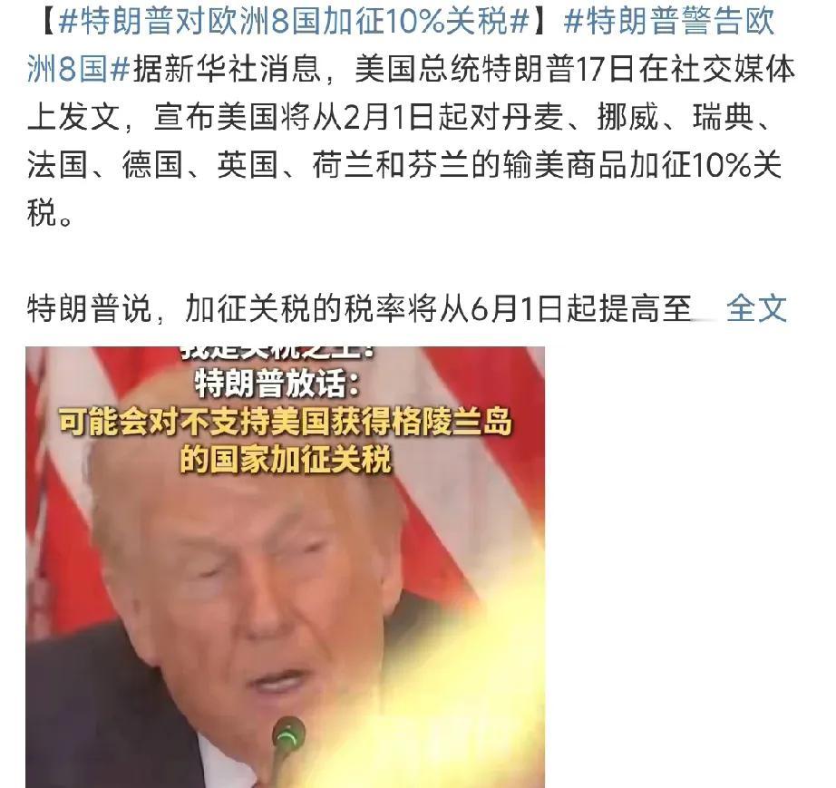 只有特朗普才能救欧洲…… 我们发现: 俄乌战争四年以来,对于俄罗斯来说,欧洲扮演的角色始终是被动的、软弱的,甚至是乞求式的。 而现在面对特朗普利益性强权,欧洲只有选择全方位的俯首称臣,才有重新崛起借力打力的机会。 否则,欧洲将面临俄美同时夹击的军事、经济与政治等多重危机。 其实: 特朗普现在宣布对欧洲8国加税已经是很面子了。 否则,突然对格陵兰岛宣布主权,也是完全可以实现的! 没办法,这就是欧洲的宿命,只有特朗普才能救欧洲。