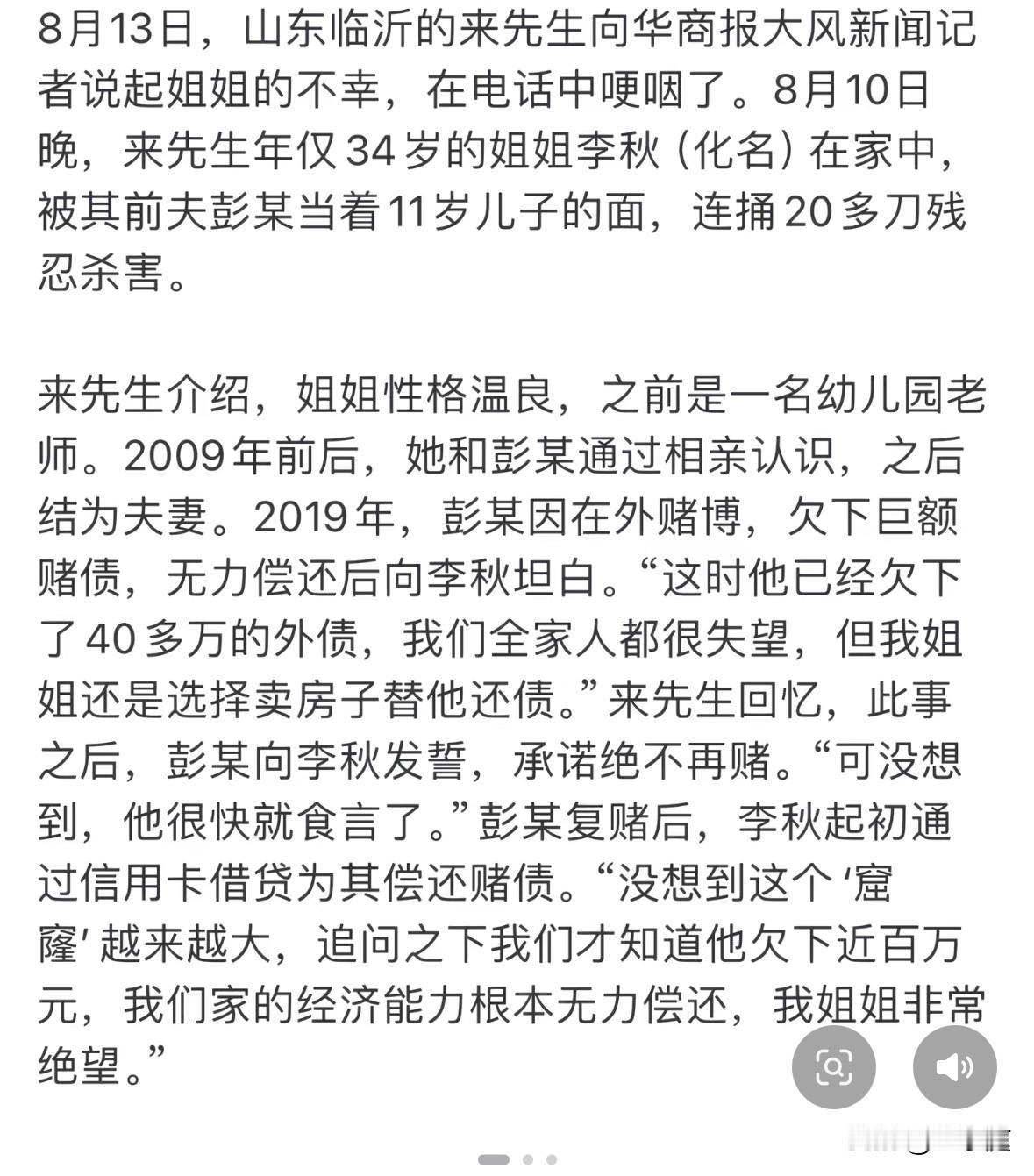 被前夫杀害的34岁山东女子,生前曾苦苦哀求他,说孩子还没长大请求他不要动刀子。结果,对方仍不管不顾,将她残忍杀害。 更让人心疼的一点是,他在做那一切的时候,她们年仅11岁的孩子就在身边! 这个可怜的女人姓来,1991年出生。她善良贤淑,是一名幼儿园老师。 结婚以后,她和丈夫育有一子。平日里,她一边工作一边操持家庭。日子虽然不算富贵,但该有的一样不差。奈何,其丈夫却不懂好好珍惜。 事实上,在结婚不久,对方就暴露了本性。他嗜赌成性,一度把家里的钱财都输光了。 那会,来女士还年轻,以为爱情能战胜一切!为了儿子,也为了家庭,她一次次原谅,一次次给他机会。甚至,不惜卖掉房子替他还款。殊不知,再好的女人也无法唤醒一个没有良知的男人! 来女士历经磨难后,选择离婚。为了抚养儿子,她一人打两份工,并没有找前夫拿抚养费。如此仁至义尽,本以为可以迎来新生,没想到,对方却没有半分感恩之心! 2025年8月10日晚,前夫彭某以看孩子为由敲开了来女士的家门。当晚,来女士遇害前,已经察觉到了危险。对此,曾苦苦哀求他,说孩子还那么小,请他冷静下来,千万不要动刀子! 那时候她们11岁的孩子就在身边,他也一直在哀求父亲。然而,彭某却仍没有动半分恻隐之心。 可怜的来女士,就那样失去了生命! 期间,彭某还一直阻止自己的儿子向外界求助。直到来女士血都流干了,他才报警自首! 彭某如此恶行,实在是让人难以接受。如今,案子会在2026年1月开庭审理,在此坚信,等待彭某的必是法律的严惩! 在这背后,除了疼惜来女士的遭遇,她的儿子更让人心疼,自母亲遇害后,他一直陷进了不该开门的自责中。他才11岁,还那么小,正是需要爸爸妈妈抚养和陪伴的年纪啊!