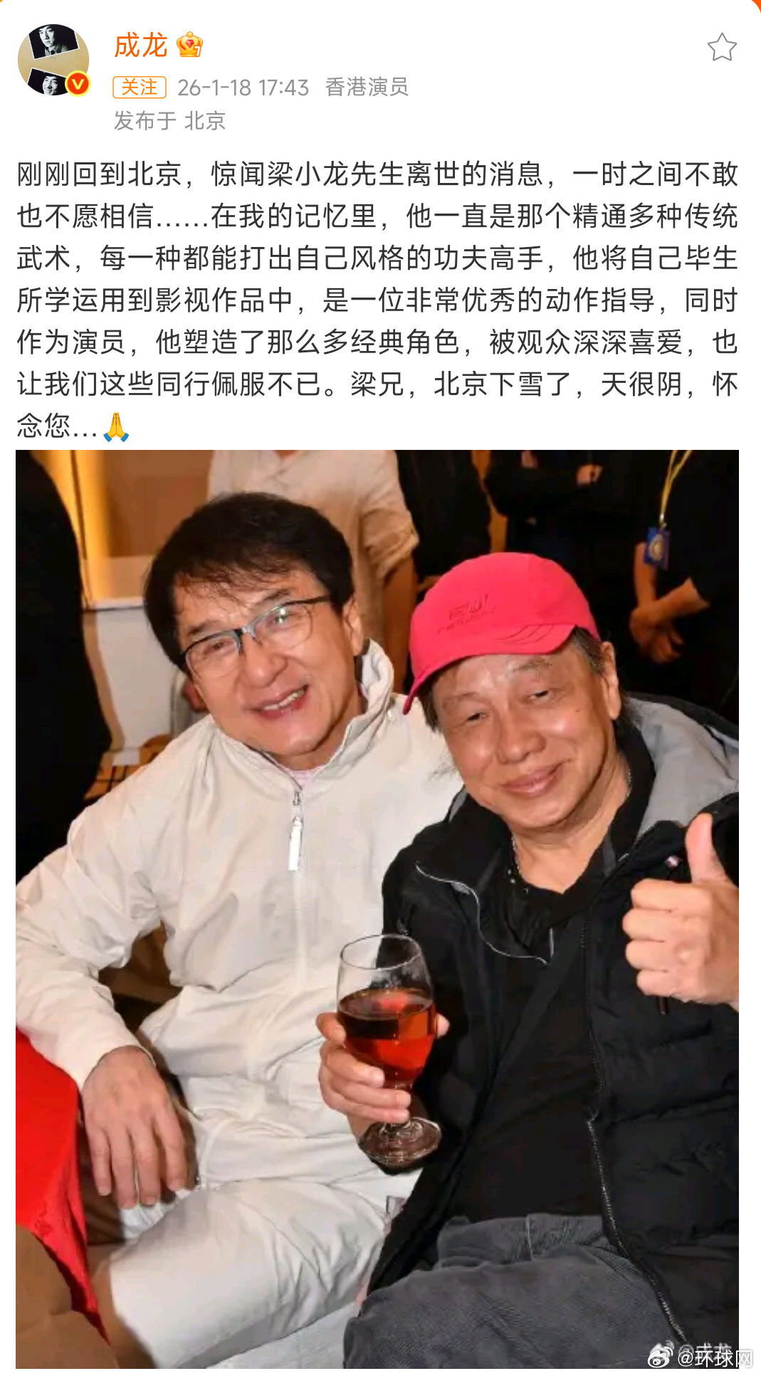 #成龙发文悼念梁小龙#【“火云邪神”梁小龙去世,成龙发文悼念】据中国香港媒体1月18日报道,凭借《功夫》《陈真》等作品深入人心的演员梁小龙,于1月14日不幸离世,享年77岁。香港电影人田启文接受中新网记者采访时表示,刚得知梁小龙过世的消息,难以接受;自己刚入行时就与梁小龙关系熟络,还曾担任过梁小龙的经纪人。田启文称梁小龙“永远在心中”,对方给了很多难忘回忆,这些点滴难以一时说尽。暂时未确定是否参加丧礼,需看后续时间情况。18日,成龙发文悼念:“惊闻梁小龙先生离世的消息,一时之间不敢也不愿相信……在我的记忆里,他一直是那个精通多种传统武术,每一种都能打出自己风格的功夫高手,他将自己毕生所学运用到影视作品中,是一位非常优秀的动作指导,同时作为演员,他塑造了那么多经典角色,被观众深深喜爱,也让我们这些同行佩服不已。”梁小龙,1948年4月28日出生于中国广东省中山市,中国香港男演员、武术家、武术指导。在上世纪70年代,梁小龙与李小龙、成龙、狄龙合称“香港演艺圈四小龙”。梁小龙早年曾出演电影《功夫》中“火云邪神”一角,在香港电视剧《大侠霍元甲》和《陈真》中饰演霍元甲的徒弟、民族英雄“陈真”,这些剧作当时风靡中国大陆,他也由此成为上世纪80年代初香港最负盛名的武打明星之一。