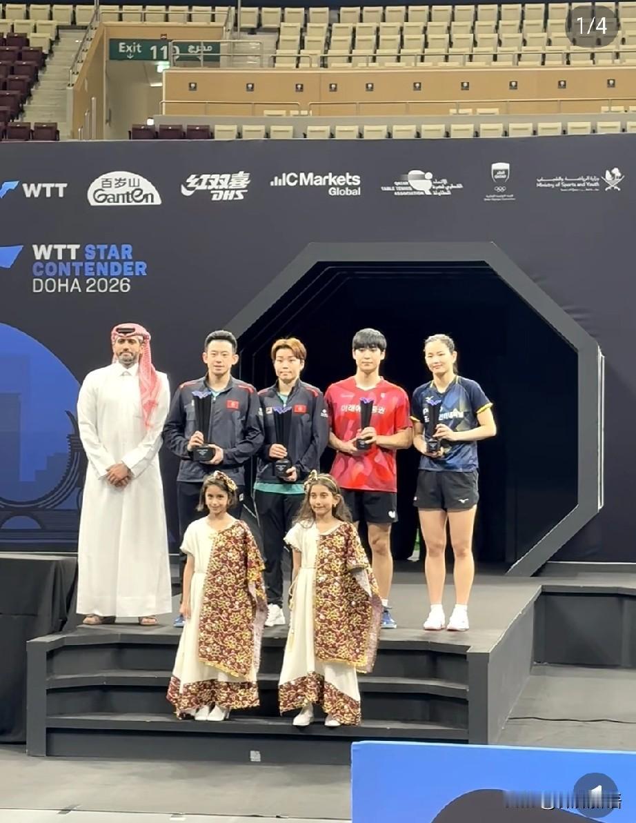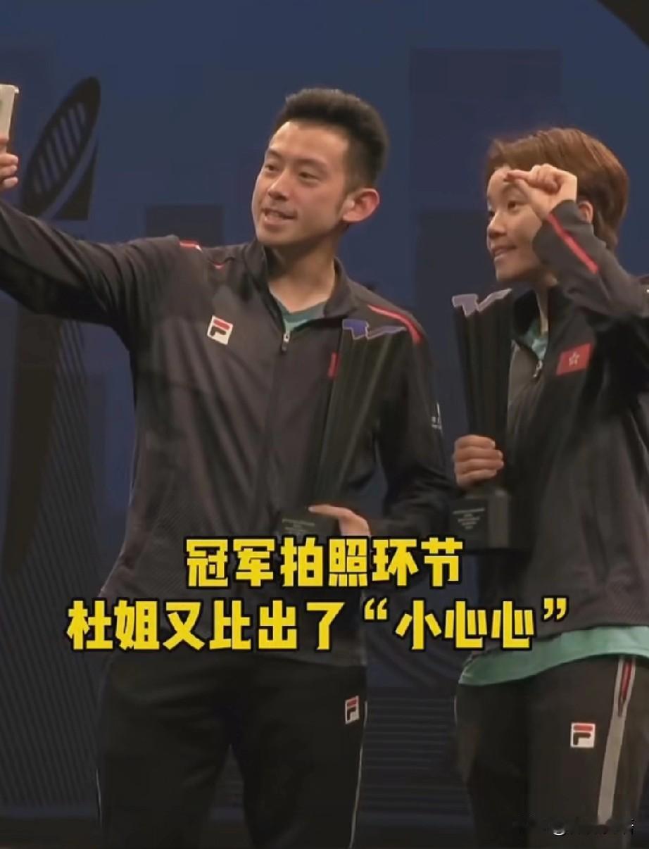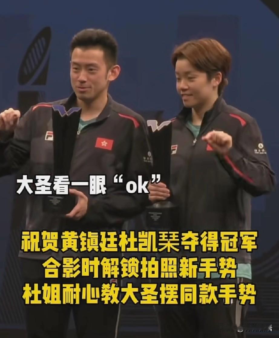 恭喜黄镇廷杜凯琹夺得混双冠军。 在刚刚结束的多哈球星挑战赛混双决赛,黄镇廷/杜凯琹3-1朴康贤/金娜英,比分:9-11,11-8,11-9,11-5,港队拿到了2026年第一冠,恭喜恭喜,这就是三届世乒铜牌的含金量。刚刚看到张瑞教练也发文了,发了混双冠亚军合影,看大圣和杜姐两个人笑的真开心。 这次拍冠军照的时候,杜凯琹又解锁了新手势,她和大圣说比心,大圣说可以。大家说这个手势是“小小比赛拿捏拿捏”,现在俩人拿奖杯也熟练了,想起之前俩人拿混双奖杯,以为只有一个,还在那抢着拿,后来才知道是一人一个,现在奖杯拿的多了,也熟练了。这下大圣又可以给楹楹带回去新的玩具了。 这次多哈之旅港队也有收获,这一站比赛结束,杜凯琹、黄镇廷也要继续参加WTT常规挑战赛马斯喀特站的比赛,估计明天就要出发了,去了要适应一下场地,因为两个地方离得近,很多人也就报名参赛了,继续加油哦!