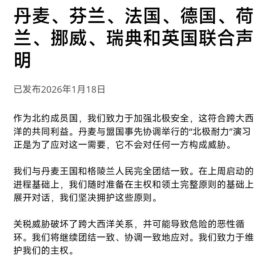 1月18日,由于格陵兰岛问题被特朗普加征关税的欧洲8国,刚刚发表了一个联合声明。仔细读下来,一个总体的感觉是:虽然隐晦地表达了自己的主权原则和立场,但充满了对美国的恐惧和小心翼翼。最有意思的是,这个声明本来是要回应美国,但通篇没有提及美国和特朗普。那么,如何看待这份“没有收信人”的联合声明呢? 首先,声明开头第一句就把“北极耐力”这个让特朗普暴怒的军事部署,主动定义成“无害、无威胁”。这句话几乎是直接对着特朗普喊:“我们不是冲你来的,千万别误会。”这可谓是典型的敢做不敢当,这次几十个人的军力部署,就是针对特朗普要强占格陵兰岛而来的,但声明当中完全不提甚至是否认。显然一开始在美国面前就气短了。 第二,整个声明用词十分温和且中性,完全没有提到“美国”“特朗普”“威胁”“敲诈”“勒索”等词,可以说把这篇声明的针对性和火药味降到了最低点。说实话,这篇声明当中没有任何的指向,特朗普甚至完全可以不做回应。声明当中虽然提到了“关税威胁”,但到底是谁制造的关税威胁呢?是美国,中国还是其他国家呢?如此模糊的声明还是令人叹为观止的。 第三,声明当中反复强调要进行对话,而不是对抗,展现出了极强的妥协姿态。这个语气也非常奇怪,要知道美国才是要强占领土的一方,欧洲在这里反而显得有些低声下气了。声音当中虽然强调了主权原则,但依然与美国保留了对话的空间。这里就很有意思了,既然主权是不可妥协的,那你们准备谈一些什么呢?一开始就把自己的底线给让出去了,未来还怎么去谈呢? 第四,对于特朗普关税的回应非常克制,没有提到任何反制的问题。声明当中只强调关税有可能使跨大西洋关系进入下降的螺旋,但语气实际上已经非常缓和了。而且和去年美欧贸易战的时候不同,欧洲方面没有提出任何关税反制和对等升级的诉求。看来欧洲也非常担心惹怒特朗普,更担心他会在失控之下,做出其他的非常规举动。从特朗普军事打击委内瑞拉就能看出,他目前在西半球的军事行动上完全没有禁区。 总的来看,这份声明表明,欧洲很清楚现在实力对比,不敢把特朗普逼到墙角。联合声明故意选了最“外交化”、最不刺激的版本。这是一种在实力不对等下的“极限克制”策略,符合当前欧洲对特朗普的整体心态:虽恨但怕,担忧把跨大西洋关系彻底玩崩。欧洲似乎已经完全没了独立性和斗志,短期内恐怕会继续被特朗普予取予求。