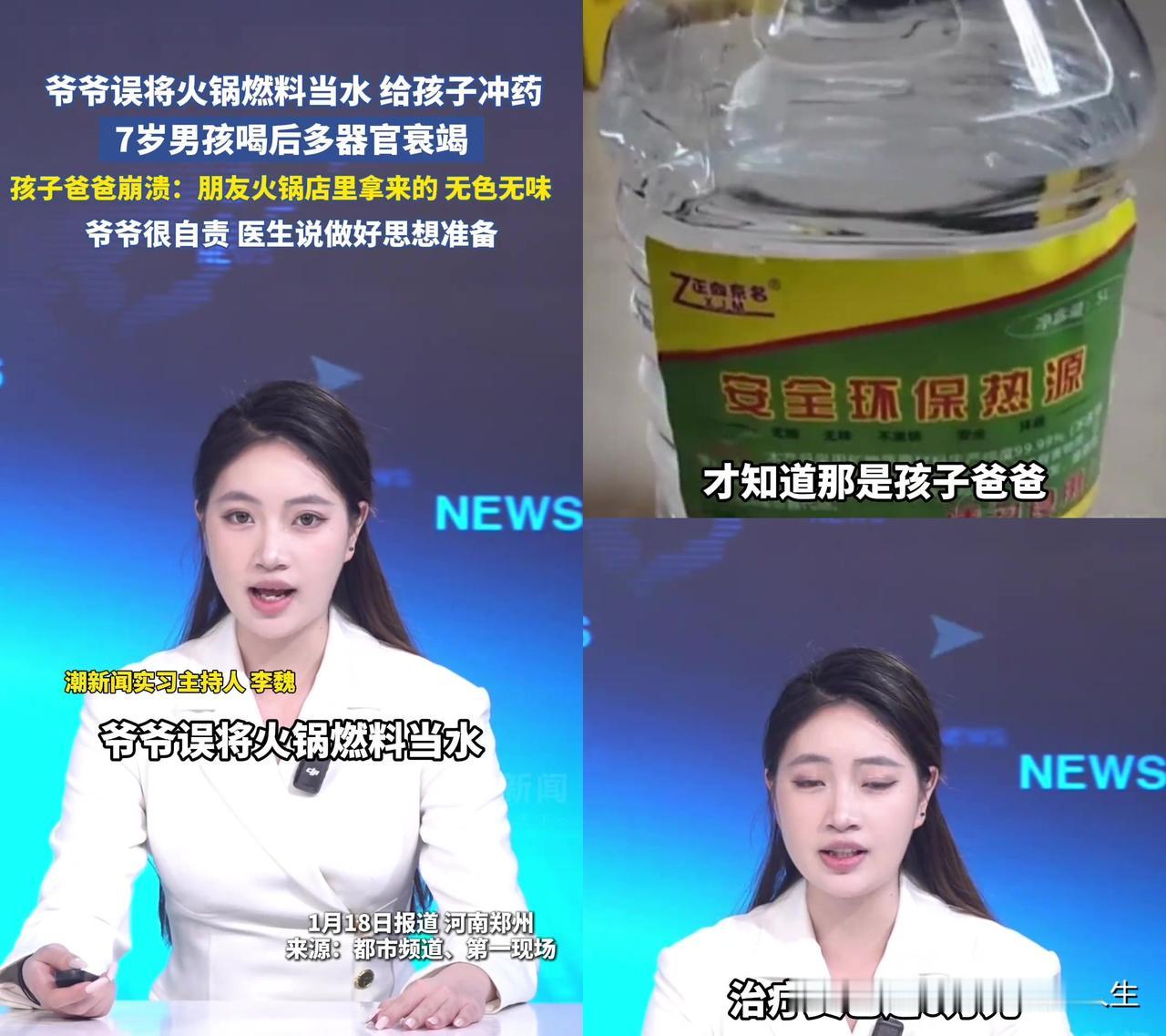 7岁轩轩喝了爷爷冲的感冒灵,现在躺在ICU里快没了。 爷爷不是故意的,他把朋友从火锅店带的火锅燃料当水了,装在饮料瓶里,无色无味,冲药时没看出来。 可这不是水啊!是甲醇!儿童喝30ml就能死,轩轩一口下去就踩了致死线,肝肾瞬间烧穿,医生说“做好思想准备”,爸爸蹲在走廊里哭,爷爷扇自己耳光说“我该先尝一口”。 老人不是粗心,是这瓶水太会装!咱们都有这习惯:饮料瓶喝完不扔,装机油、装燃料、装农药,装着装着就忘了这瓶子本来是装喝的!前阵我家还有人用雪碧瓶装机油,我半夜渴了差点灌下去,换谁迷糊的时候不看错? 更气人的是,国家18年就规定了!餐饮用甲醇燃料得加色警示,可朋友从火锅店拿的时候,还是装在透明饮料瓶里,谁能想到水会藏毒? 最惨的是,这祸本可以避免:装危险物时用个有颜色的瓶子,贴个“剧毒”标签,或者跟家里人说一声“这瓶不能碰”。可咱们总觉得“不会那么巧”,直到巧到自己孩子身上。 爷爷现在悔得要跳楼,爸爸崩溃到说不出话,可最该骂的是用饮料瓶装危险物的破习惯,老人不是没文化,是这习惯太杀人! 你说,要是那瓶燃料装在棕色瓶里,或者贴个“有毒”纸条,爷爷还会拿它冲药吗? 轩轩还在ICU里熬着,可这世上哪有要是啊? 那些爱用饮料瓶装危险物的人,能不能醒一醒?你省的是个瓶子,害的可能是条人命!