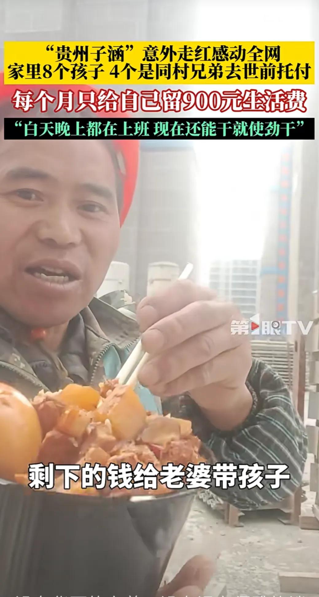 破防了!农民工大叔“贵州子涵”意外走红感动全网,家里有8个孩子,其中4个是同村兄弟去世前托付照顾的,他每个月只给自己留900元的生活费,其他的钱都留给妻子养育孩子。他说:“送孩子们读书是我的责任,现在还能干我就使劲干!网友:没有华丽的衣着,没有温文儒雅的谈吐,却有着很多男人没有的责任和担当。 工地上的风硬得像刀子,吹得他脸上的皱纹里全是灰尘。每天天不亮他就爬起来,扛着钢筋、拌着水泥,干到深夜才拖着一身疲惫回到工棚。900块钱,在城里连房租都不够,他却要靠这个撑过一个月——早餐是两个馒头,中午啃着最便宜的盒饭,晚上就着工友分的咸菜泡一碗面。有人问他苦不苦,他抹了把脸笑,说“看着孩子们能上学,就不觉得累”。 同村兄弟走的时候,拉着他的手说“孩子就托付给你了”。他没什么文化,不懂什么叫一诺千金,只知道答应了的事,就得做到。这些年,他没让一个孩子辍学,哪怕自己白天在工地搬砖,晚上还要去兼职守仓库,也从来没松过口。妻子在家带着8个孩子,他把所有工资都打回去,自己连件新衣服都舍不得买。 我们总在说“责任”“担当”,可真正能做到的人太少了。有些人嘴上说着“兄弟如手足”,遇到事却跑得比谁都快。这个农民工大叔,没读过什么书,却用最笨的方式守住了承诺。他的肩膀不宽,却扛住了8个孩子的未来;他的话不多,却比任何豪言壮语都让人动容。 网上有人说他“傻”,觉得没必要把别人的孩子当成自己的。可他不懂这些弯弯绕绕,只知道“人要讲良心”。在他眼里,孩子就是希望,不管是不是亲生的,都得让他们好好长大。这份朴素的善良,比任何精致的利己主义都珍贵。 各位读者你们怎么看?欢迎在评论区讨论。
