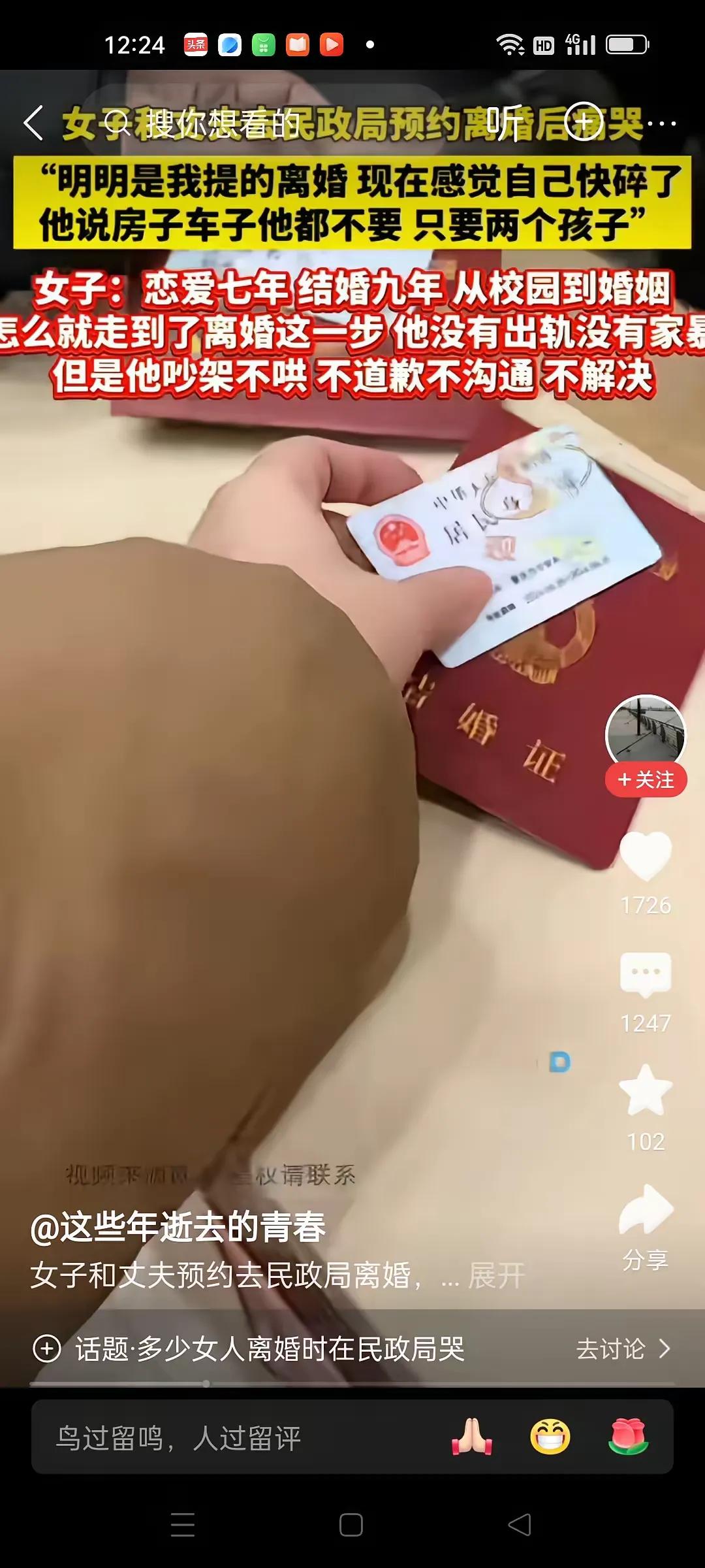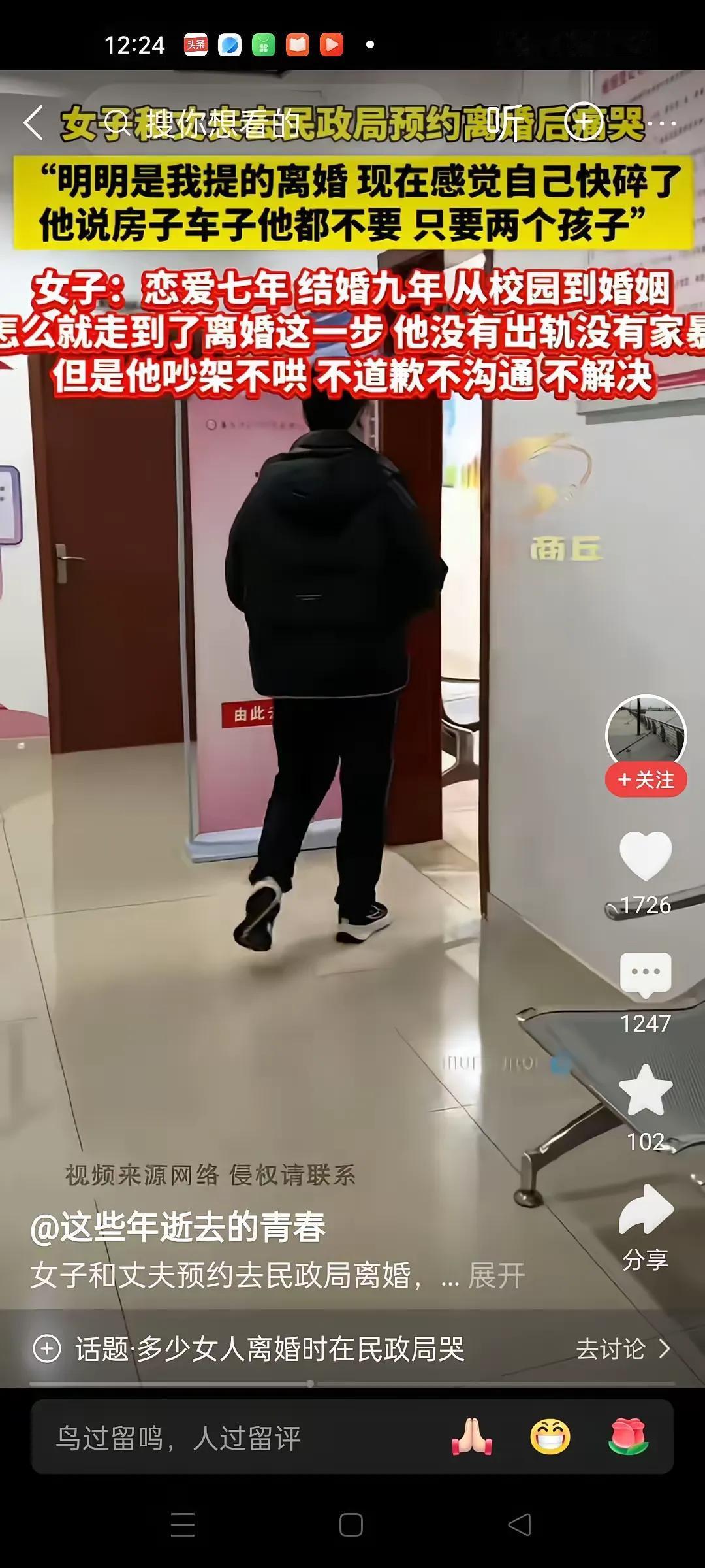 女子和丈夫去民政局预约离婚后痛哭。女子说,明明是我提出的离婚,现在感觉自己快碎了。恋爱七年,结婚九年,从校园到婚姻怎么就走到离婚这一地步?他没有出轨没有家暴,但是他吵架不哄,不道歉不沟通不解决。这一次,他不要房子车子只要两个孩子。女人看上去是后悔了,男人却头也不回。网友:女人有时就是矫情,现在好端端的一个家庭作没了。 他没出轨没家暴,把房子车子都留给妻子,只要孩子,这份担当在当下已经是稀缺品。他的沉默不是冷漠,是被“男人不能情绪化”的观念捆住了手脚。吵架时不哄,不是不在乎,是怕一开口就被指责“只会说漂亮话”;不道歉不沟通,不是不想解决,是觉得解释再多也抵不过一句“你总是这样”。 他头也不回地走,不是狠心,是怕转身看见妻子的眼泪,自己就绷不住了。男人的愧疚从来不会挂在嘴边,只会用行动表达——把物质都留给妻子,把孩子带在身边,算是给这段十六年的感情留最后一点体面。 总有人说女人矫情,可没人看见男人深夜里偷偷抽烟的样子。他不是不想给拥抱,是被生活磨得没了力气;不是不想沟通,是怕说多错多,反而让矛盾升级。婚姻里的沉默,从来不是一个人的问题,是两个人都忘了怎么好好说话。 像这样子的男子,已经很难找了。他没犯原则性错误,甚至愿意为孩子放弃所有财产,却还是留不住想要的家。婚姻里的耐心,从来不是被一次争吵磨没的,是在无数次“我错了,但你还是不依不饶”的循环里,慢慢耗尽的。 各位读者你们怎么看?欢迎在评论区讨论。