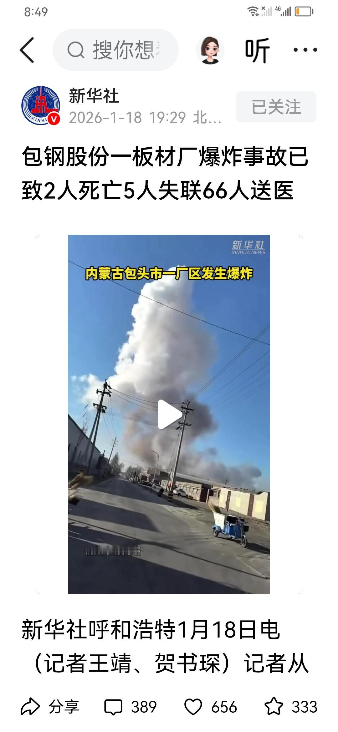包钢18日下午3时忽然发生爆炸,村民说听到巨大声响,有看到一个大铁球飞在空中,砸在一处屋顶,浓烟笼罩大地足有十几分钟才散。 是一个某村的分厂发生了事故。有说转结炉炸了。 包钢可是最大稀土生产厂。 自治区已去人了,事故调查中。 已知有2人死亡,6人伤,几十人失联。 应属特大安全事故。 安全无小事,年终岁尾尤其要加强安全保障与检查,千万别大意。 天气寒冷,华北下雪,气候恶,尤其要注意。