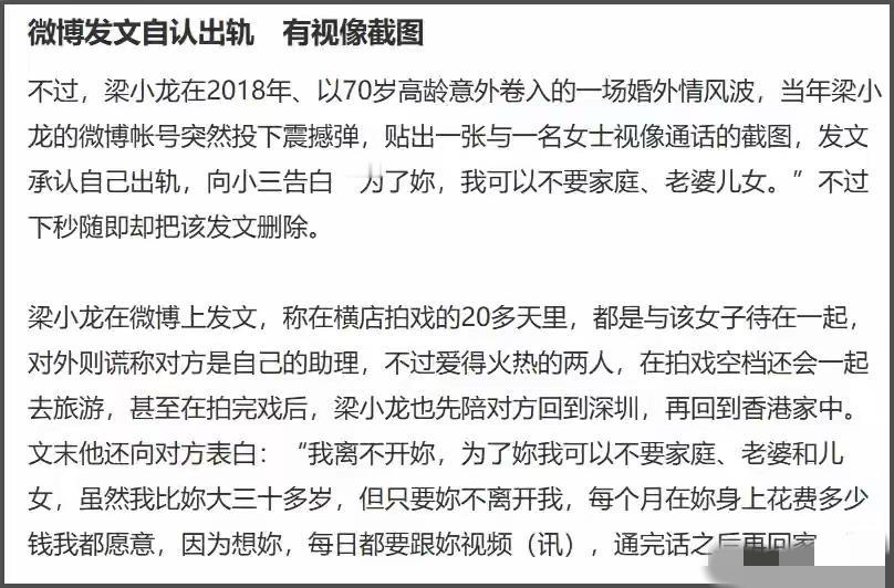 梁小龙一生可以用活的潇洒,死的“痛快”来形容了。 他一生艳福不浅,第一任妻子还是混血歌手。长的特别漂亮。 第二任妻子,比她小20多岁,对他言听计从,很贤惠,还给生了一对儿女。 梁小龙在70岁的时候还在外面炫耀自己出轨的事。真是活的潇洒。 现在77岁在睡梦中去世,没有痛苦,有的只是痛快。