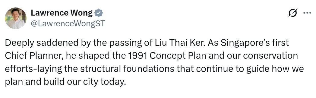 新加坡总理黄循财:惊悉刘泰克先生逝世,深感悲痛。作为新加坡首任首席规划师,他制定了1991年概念规划,并推动了我们的文物保护工作,奠定了至今仍在指导我们城市规划和建设的结构基础。