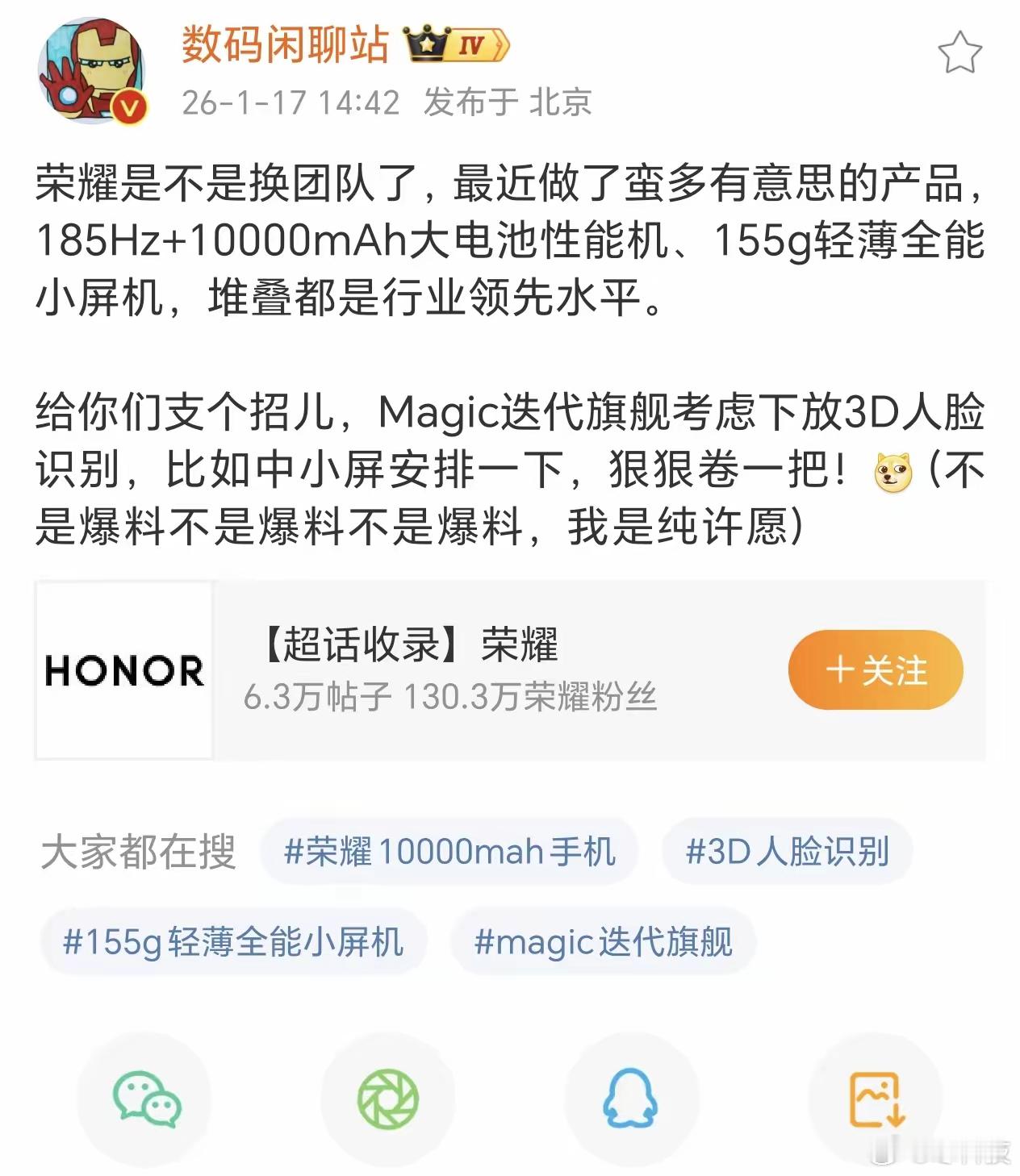 再加个长焦进去真的无敌了,其实手机就应该分两类人需求 一类人长续航打游戏, 一类人长续航拍照,至少荣耀目前做到了长续航!