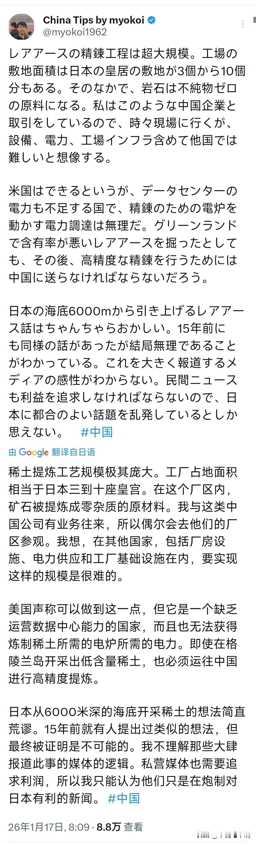 日本还是有明白人的。这位长期在上海工作的日本人1月17日写道,稀土提炼工艺规模极其庞大。工厂占地面积相当于日本三到十座皇宫。在这个厂区内,矿石被提炼成零杂质的原材料。我与这类中国公司有业务往来,所以偶尔会去他们的厂区参观。我想,在其他国家,包括厂房设施,电力供应和工厂基础设施在内,要实现这样的规模是很难的... 说白了,中国在稀土领域的话语权根本不是靠储量堆出来的,而是攥着全产业链的绝对优势,这事不是谁喊两句口号就能复制的。 那位长期在上海工作的日本人1月17日的感慨很实在,稀土提炼工厂动辄堪比日本三到十座皇宫的规模,背后藏着的门道,远比表面看到的更复杂。 这里可以提一个很形象的鸭舌理论,稀土就像是餐桌上的鸭舌,看着量不大却金贵,可想要这几口鸭舌,就得先养一整群鸭子、搭建养殖棚、配齐饲料和屠宰加工线,整套体系一个都不能少。 稀土冶炼从来都不是单打独斗的活儿,它极度依赖完整的工业产业链支撑,高纯度稀有金属很多时候都是产业链协同运作下的副产品,要是抛开现有产业链,专门为了提炼稀土建厂房、铺设施、保障电力供应,成本会呈数量级翻倍,根本不具备经济可行性。 也正因为懂这套逻辑,那位日本人才能看透本质,中国稀土工厂能稳定产出零杂质原料,核心不是设备多先进,而是背后有全球最完整的工业体系托底,从矿石开采到冶炼分离,每一个环节都能形成高效协同。 反观其他国家,哪怕能找到稀土矿,也很难配齐这套庞大的配套设施,更别说达到同等规模和效率了。 而最近日本一边忙着炒作“地球号”钻探船去深海开采稀土的新闻,营造自主可控的假象,一边悄悄动用稀土储备,刻意淡化中国制裁带来的影响,试图让外界误以为他们底气十足。 其实这不过是混淆视听的手段,深海开采稀土目前还停留在试验阶段,技术不成熟、成本高企,短期内根本形成不了稳定供应,象征意义远大于实际效果。 美国和日本嘴上喊着能摆脱依赖,本质上只是在弱化制裁效力,真实情况如何,业内人士都心知肚明,想要复刻中国的稀土产业模式,几乎不可能。 值得警惕的是,稀土技术已经成了境外势力觊觎的目标,防范间谍窃取技术、打击内奸早已刻不容缓。 现实中,境外势力为了获取稀土技术和资源,花招百出,把稀土粉末灌入塑料模特、溶解进矿泉水瓶走私出境的案例屡见不鲜,甚至会通过挖走科研团队、虚报品名等方式窃取核心技术。 中国在稀土提纯专利上占据全球92%的份额,高纯度提炼技术更是领先多年,这些都是耗费大量时间和精力积累的成果,绝不能让别有用心之人轻易窃取。 说到底,现在没必要纠结日本说了什么,制裁的真正效果,等一年后再看分晓,储备总有耗尽的一天,深海开采的画饼也填不上当下的产业缺口,没有完整产业链支撑,再华丽的口号也经不起时间检验。 以上仅为个人看法,你觉得日本的稀土“备胎计划”能奏效吗?欢迎在评论区留下观点。