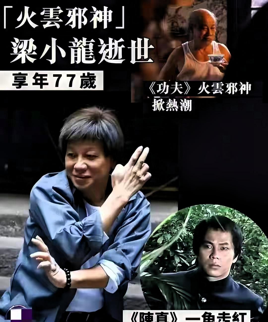 突发!“火云邪神”梁小龙离世 前一天与友人聚餐 精神饱满未见异常 那个演活了陈真、塑造出经典“火云邪神”的老戏骨,在14日永远离开了我们,享年77岁,这个消息来得实在太突然。 谁能想到,就在离世前一天,他还和友人正常聚餐,身穿黑色外套,精神状态很好,脸上带着笑容,完全看不出身体有任何不适。可仅仅过了一天,就传来了他离世的噩耗,任谁听了都会忍不住心头一沉,满是震惊和惋惜。 上世纪80年代,梁小龙饰演的陈真深入人心,一身利落的真功夫,配上满腔的家国情怀,成了无数人心中的武侠标杆。他怒踢“东亚病夫”牌匾的镜头,更是刻进了一代人的记忆深处。后来息影多年,他又凭着《功夫》里的“火云邪神”翻红,一句“天下武功无坚不摧,唯快不破”,把角色的特质演绎得淋漓尽致,这个形象至今仍是难以超越的经典。 作为香港武打片黄金时代“四小龙”之一,梁小龙拍戏从没有花架子,一招一式都是实打实的功底。晚年的他格外接地气,被网友偶遇时,合影签名来者不拒,没有半点明星架子,这样敬业又亲和的老戏骨,确实很难得。 他的离开,带走的不只是一位优秀的演员,更是一代人的青春记忆。那些守在电视机前追武侠剧的日子,那些为荧幕英雄热血沸腾的时光,终究随着他的离去,成了回不去的旧时光。老戏骨用一生诠释对演艺事业的热爱,这份执着,值得所有人铭记。