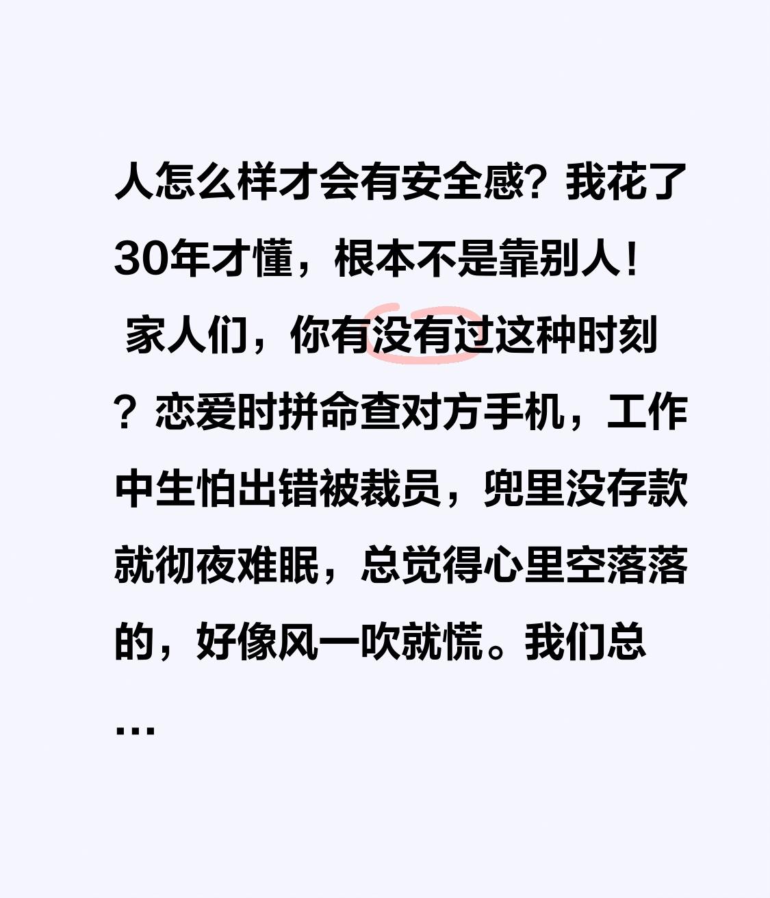 人怎么样才会有安全感?我花了30年才懂,根本不是靠别人! 家人们,你有没有过这种时刻?恋爱时拼命查对方手机,工作中生怕出错被裁员,兜里没存款就彻夜难眠,总觉得心里空落落的,好像风一吹就慌。我们总以为安全感是爱人的承诺、老板的器重、父母的兜底,直到撞了南墙才明白,这东西从来都不是别人给的! 我以前就是个十足的“安全感乞丐”。谈恋爱时,每天要查三遍男友的定位,他晚回十分钟消息,我就能脑补出一场出轨大戏;工作上唯唯诺诺,不敢提加薪不敢拒绝加班,就怕被公司淘汰;结婚后更是把老公当成救命稻草,他出差我能失眠到天亮,总觉得天塌下来得他顶着。 直到30岁那年,公司裁员,我成了其中一员,老公也因为长期冷战提出分开。那段时间我躲在家里,看着空荡荡的房间,突然发现自己活得好可悲——我把所有的安全感都寄托在别人身上,却从来没想过,自己才是最可靠的靠山。 这就是安全感的转折点:向外求的都是焦虑,向内求的才是底气。 我开始逼自己改变。失业后没哭天抢地,而是拿出积蓄报了技能课,白天学剪辑晚上接兼职,第一个月就赚了以前半个月的工资;不再盯着别人的动态,而是每天健身、读书、写日记,慢慢发现自己能扛事了;兜里的存款一点点变多,从3位数到5位数,再到有了应急基金,走路都觉得腰杆硬了。 后来我才懂,真正的安全感,是银行卡里的余额,是任何时候都能养活自己的本事,是就算孤身一人也能把日子过好的底气。它不是爱人随口的一句“我养你”,而是你可以笑着说“我养得起自己”;不是老板画的大饼,而是你随时可以跳槽的能力;不是父母的庇护,而是你能成为他们的依靠。 我们总在感情里找安全感,在工作里找安全感,却忘了安全感的终极形态,是接纳自己、强大自己。你不必完美,但要学会赚钱;不必逞强,但要学会独立;不必依赖任何人,但要学会爱自己。 现在的我,就算一个人吃饭旅行,也觉得踏实又自在。因为我知道,就算天塌下来,我也能自己撑起来。 你是不是也在向外寻求安全感?不妨停下来问问自己,你为自己攒下了多少底气?评论区聊聊你的故事,我们一起做自己的靠山!