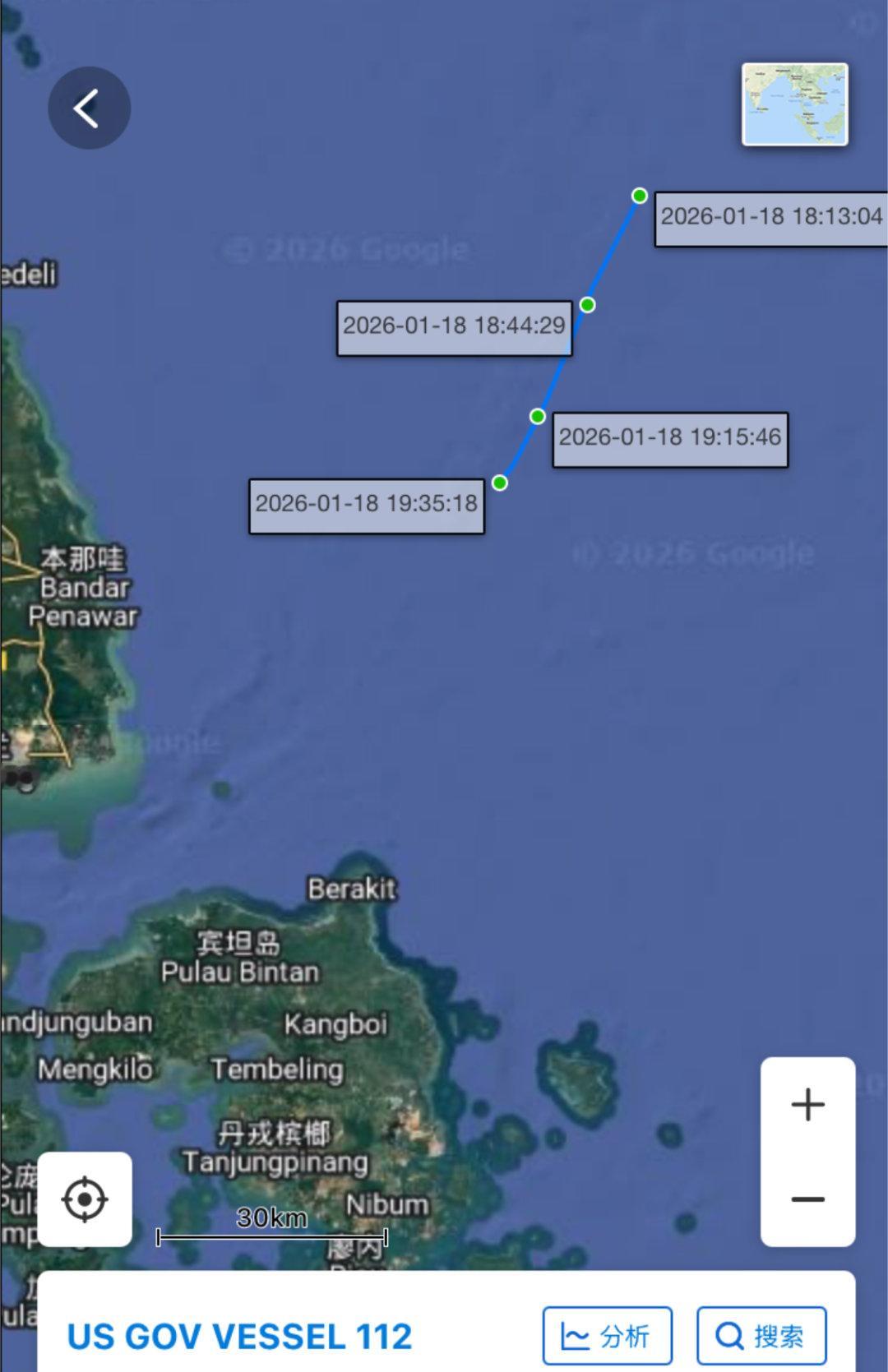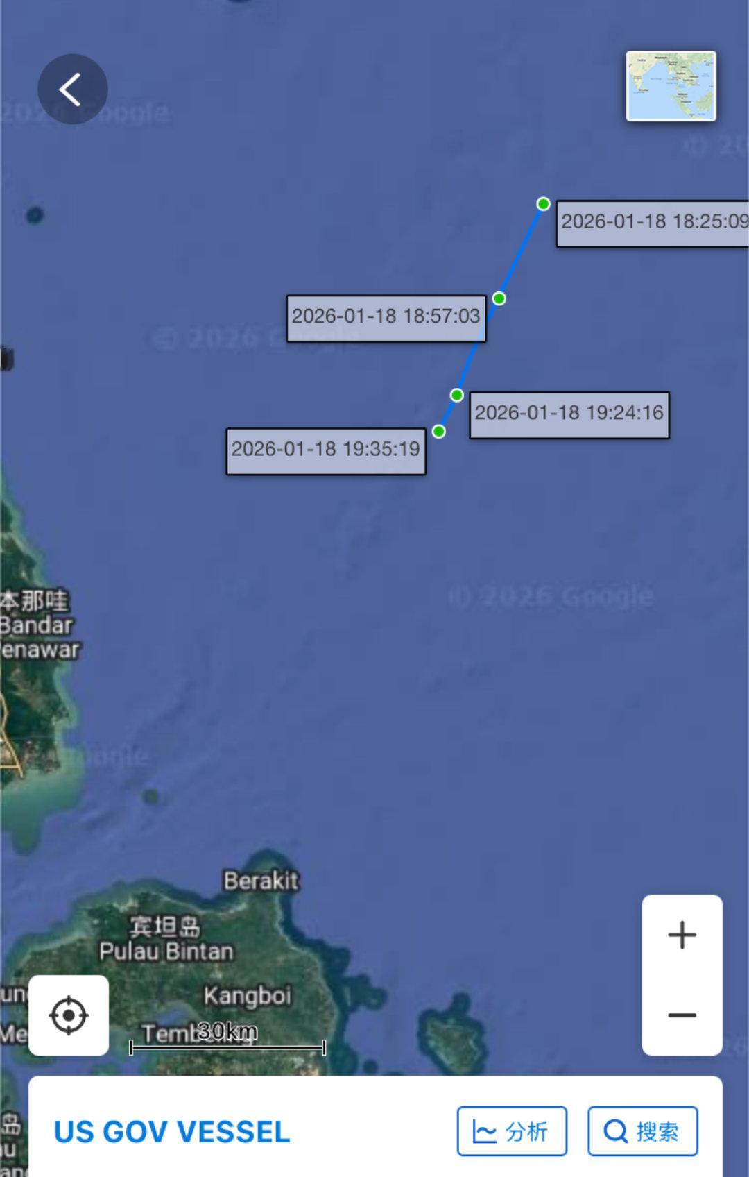 林肯号航母打击群抵达新加坡海峡——AIS信号显示,1月18号,美国海军林肯号(CVN-72)航母打击群,包括斯普鲁恩斯号(DDG-111),迈克尔·墨菲号(DDG-112)已抵达新加坡海峡入口附近,即将通过马六甲海峡前往中东。烽火问鼎计划美国航母动态
